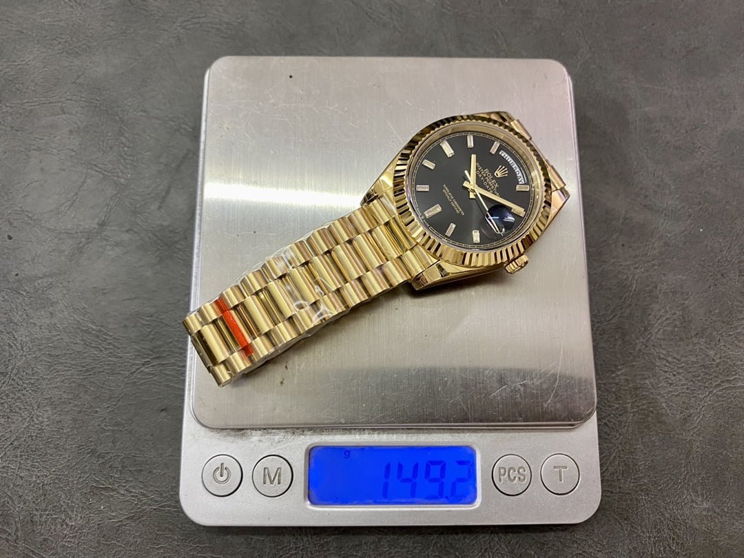 Here are the specifications of the V2 version of 18k Yellow Gold plated 40 Daydate Rolex Weekly Journal 1:1 Superclone 2836 Movement 40mm Counterweight day date black face: