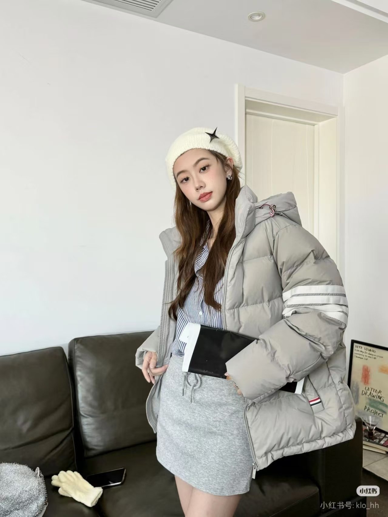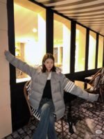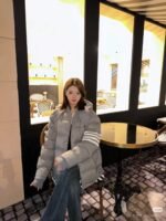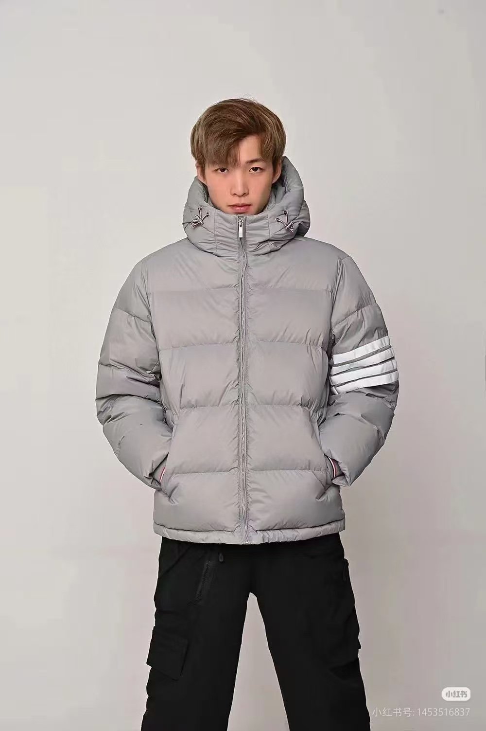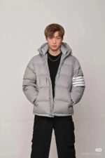 Thom Browne TB Classic Four-Stripe Hooded Down Jacket – On-body effect #