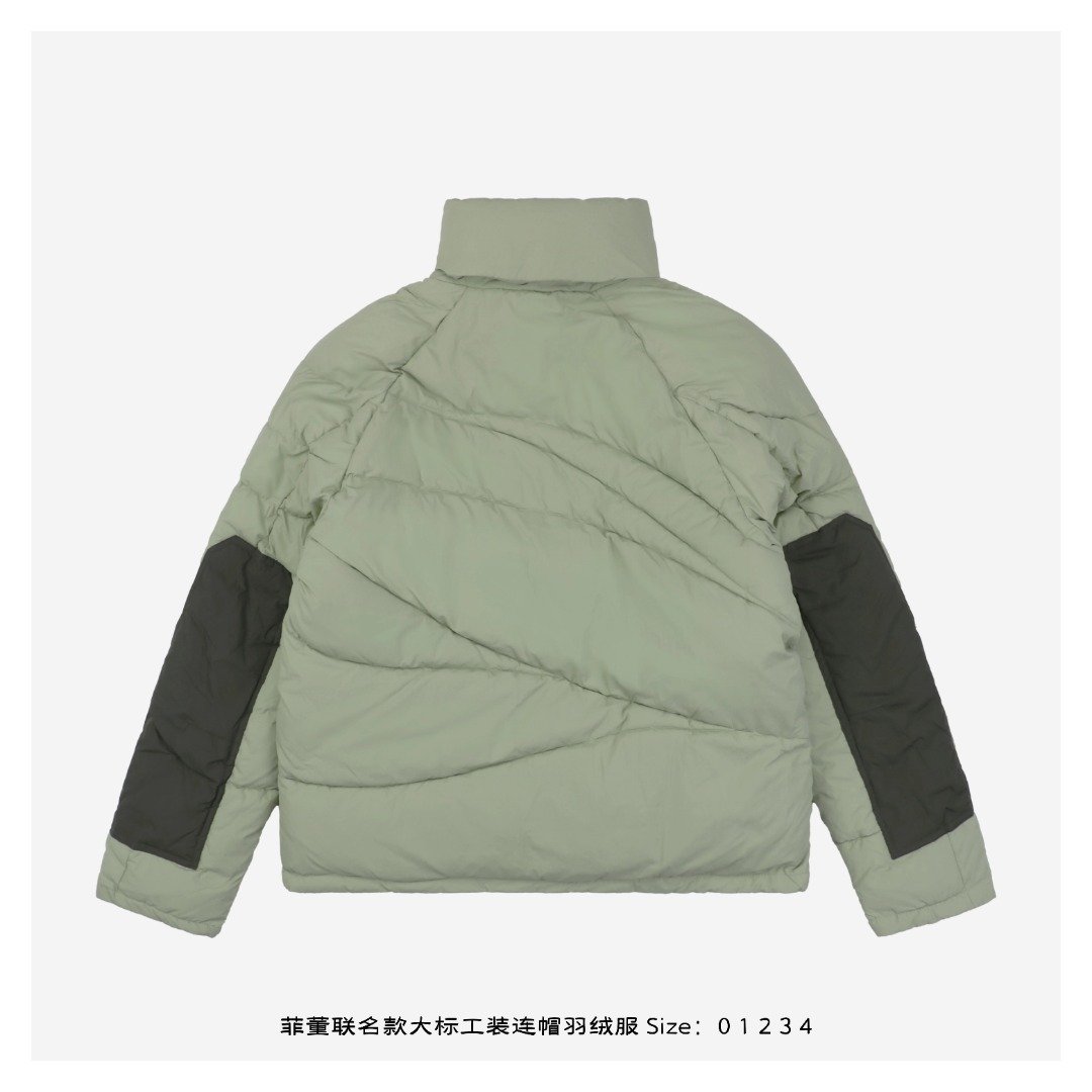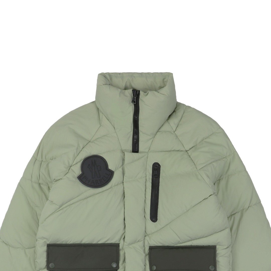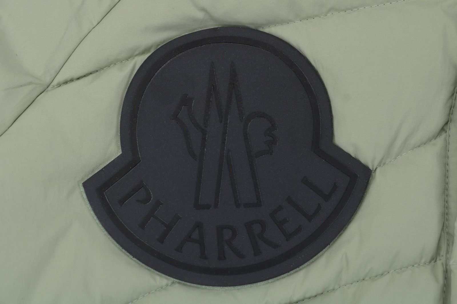 Pharrell The Williams collaboration features a unisex silhouette and multiple styling options, along with a playful logo design. Combining fashion and functionality, the garment is made from custom-woven and dyed high-quality nylon with meticulous stitching, resulting in a lightweight and comfortable feel. The refreshing green color breaks the monotony of winter, adding vibrancy and style. The hood is detachable, and the inner shoulder straps offer multiple wearing options, exuding a sophisticated look. Simple yet elegant, the garment combines stylish design with excellent warmth and comfort, offering both style and warmth. It’s three-dimensional, full, and highly practical, filled with 70% white duck down. Sizes range from 430g to 520g. Unisex, with custom-made accessories and labels.