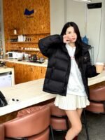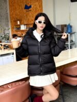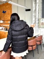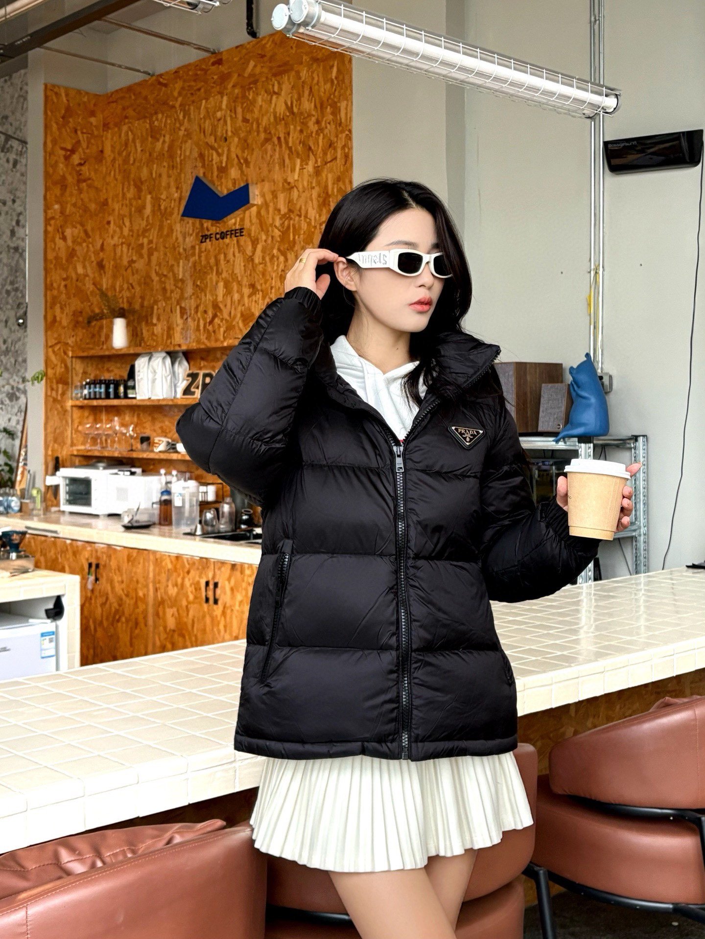 Prada 25Fw hooded down jacket with triangle logo on chest – how it looks when worn #