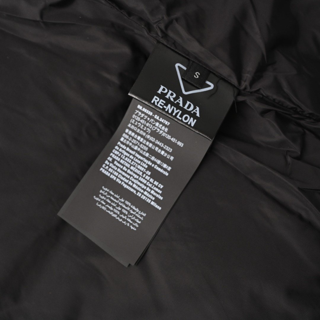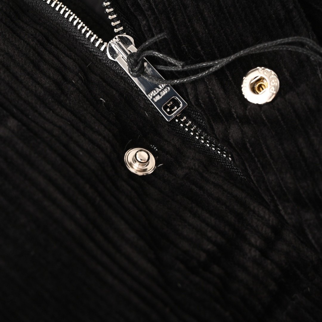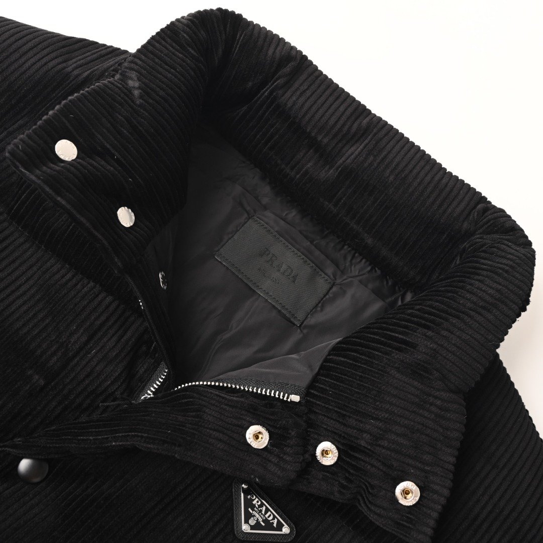This cropped corduroy down vest embodies Prada’s eclectic personality. The metal triangle logo showcases the iconic element. Corduroy is a production pain point, resulting in significant fabric variations in sheen and nap, leading to substantial waste. Custom-woven and dyed fabric eliminates concerns about color differences. The fabric density ensures exceptional drape. In terms of texture and feel, it surpasses the alloy version, a 1:1 replica made without regard to cost.