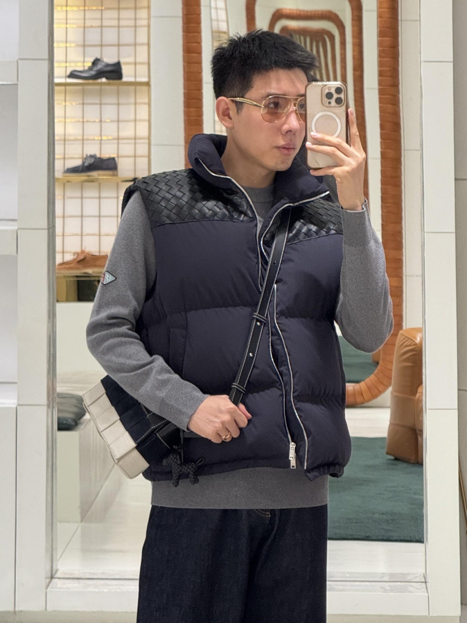 BOTTEGA VENETA (BV) Lambskin Woven Shoulder Panel Down Vest – Wearing Reference