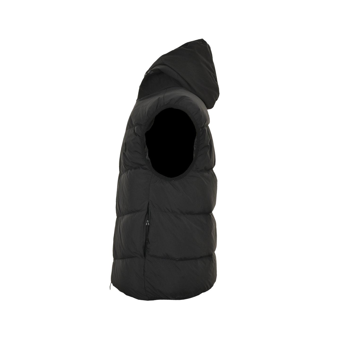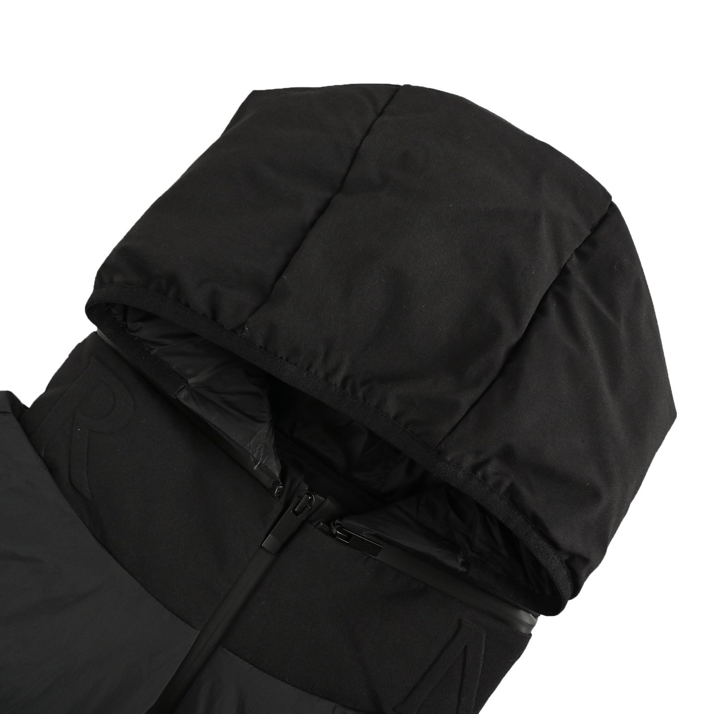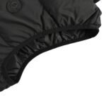 The fabric is 100% nylon, manufactured using advanced weaving techniques to create a dense and durable material that enhances the skeletal strength for windproofing and warmth. Special treatment provides waterproofing, windproofing, and a lotus leaf effect, while also being wrinkle-resistant, shape-retaining, and easy to care for. The quilting uses approximately 70-degree diagonal parallel stitches to separate the fabric and filling into independent functional areas, allowing for greater deformation under tension and pressure, and reducing the risk of breakage. The vest has a modern and sophisticated look. The hood can be removed, and the stand-up collar reveals an embossed logo in the same color scheme, adding a unique sensory detail. It is filled with 90% selected white duck down, weighing 170g, offering a fluffy, quick-rebound, lightweight, and warm feel. Accessories include a 1:1 custom-made zipper pendant, badge, and three-label.