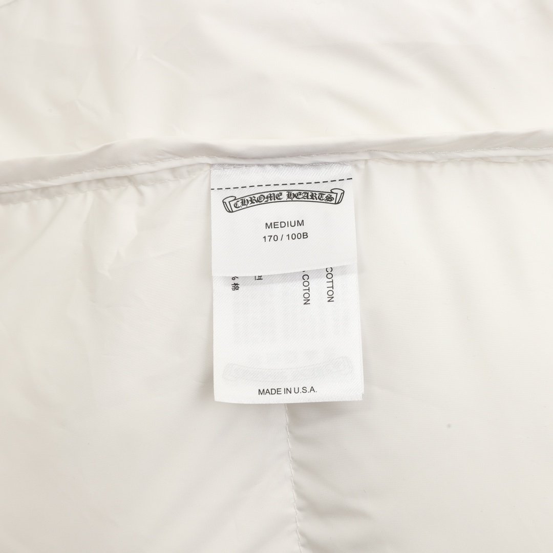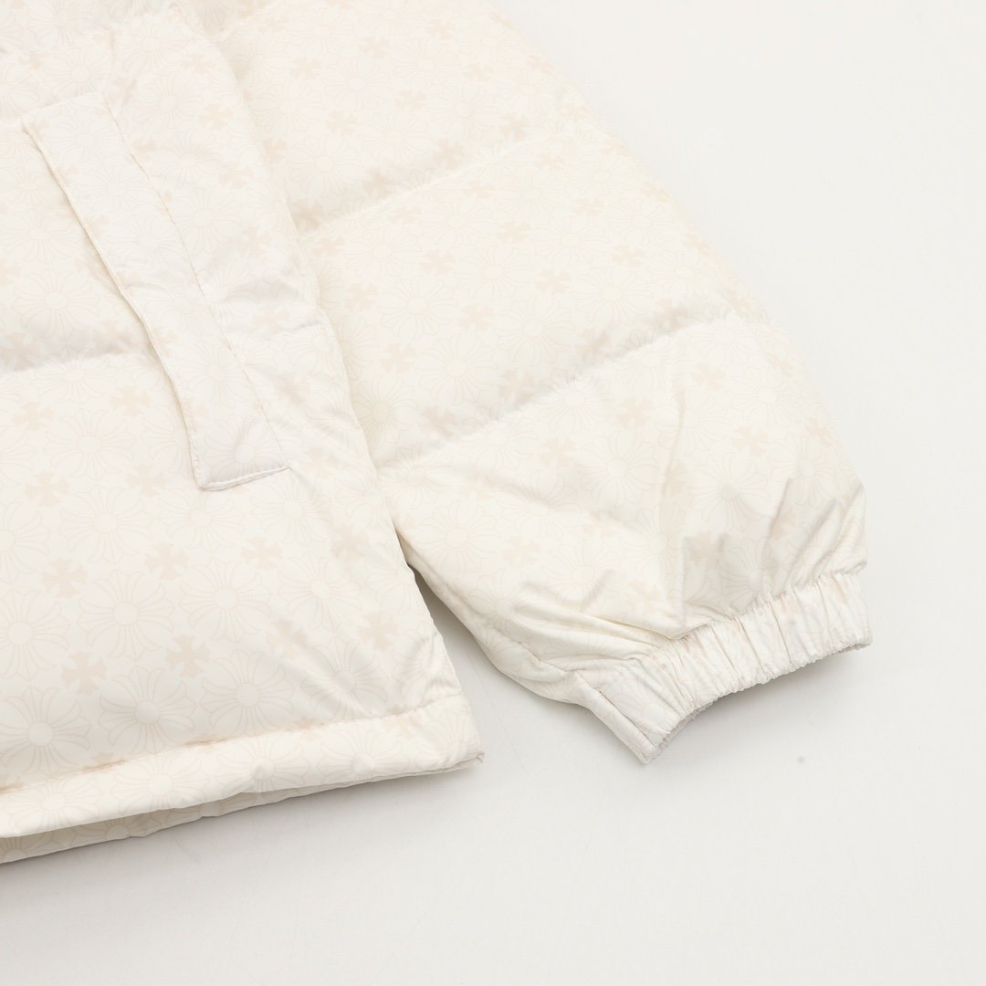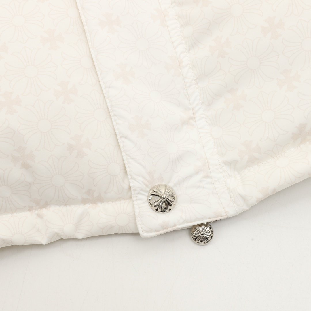 High-quality, evenly filled down ensures excellent warmth. The fabric features a unique jacquard pattern, creating a rich, three-dimensional visual effect that is both beautiful and stylish. High-quality, waterproof, stain-resistant, and breathable fabric ensures practicality and comfort. Attention to detail is evident in the excellent stitching, with even and fine stitches, free of skipped or missing stitches, showcasing superior craftsmanship. The Chrome Hearts filling, a signature feature of the brand, adds to the garment’s aesthetic appeal. Features such as windproof cuffs and an adjustable hem enhance convenience and comfort. High-quality materials are used for zippers, buttons, and other hardware, resulting in a smooth, burr-free surface for durability.
