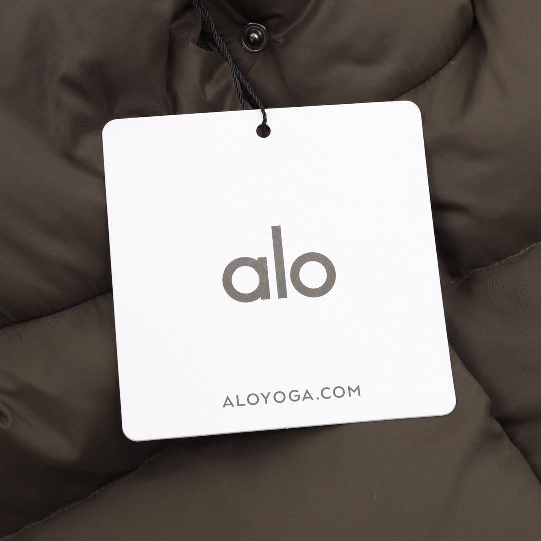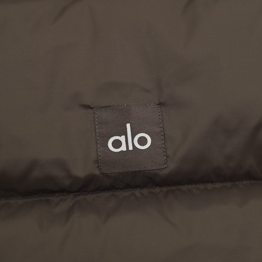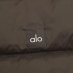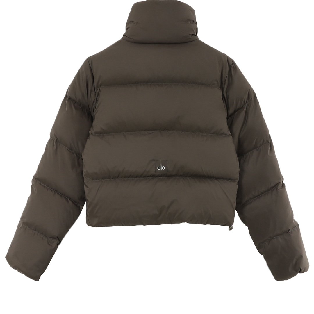 ALO yoga short down jacket with gold label and stand-up collar