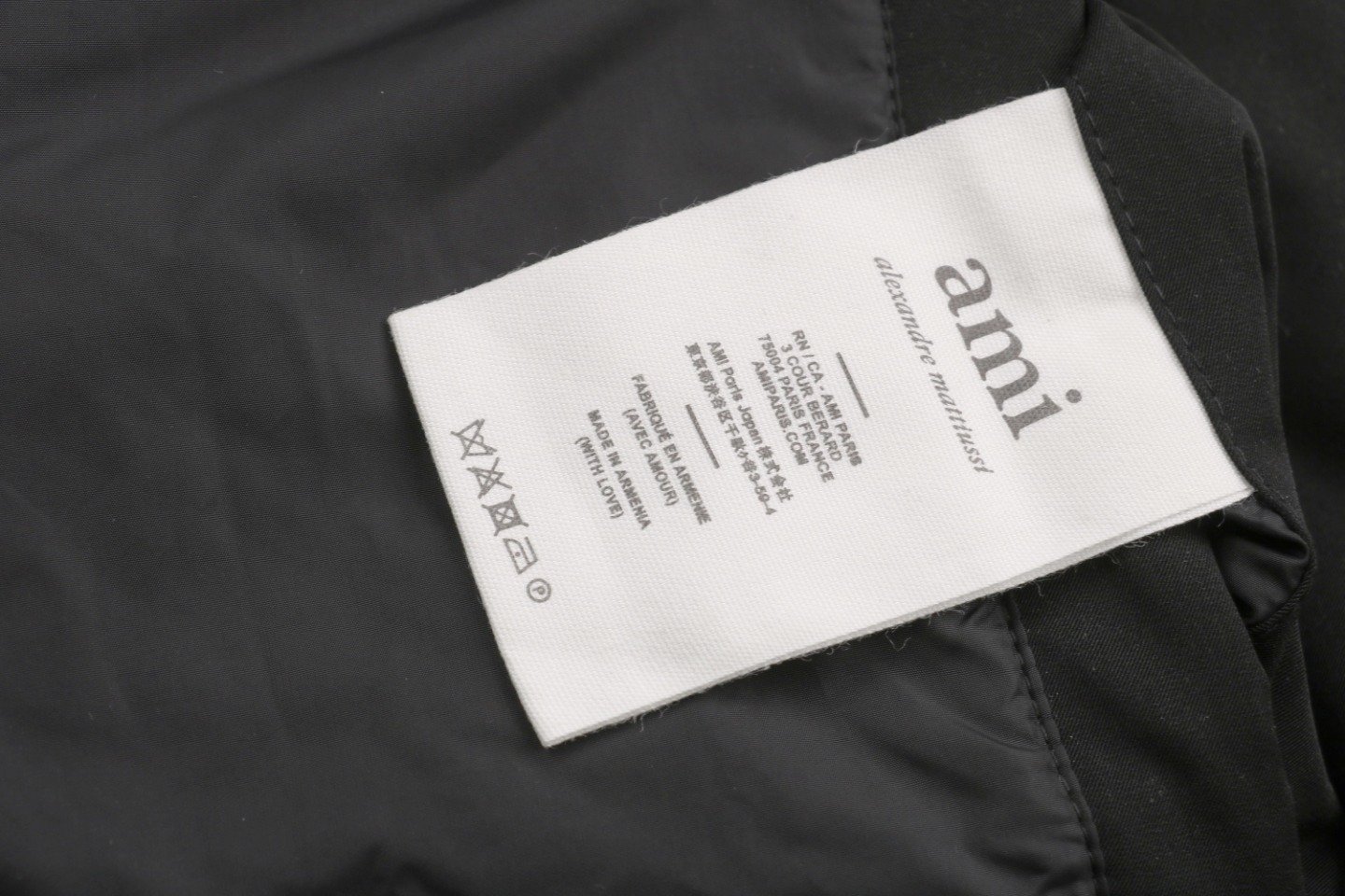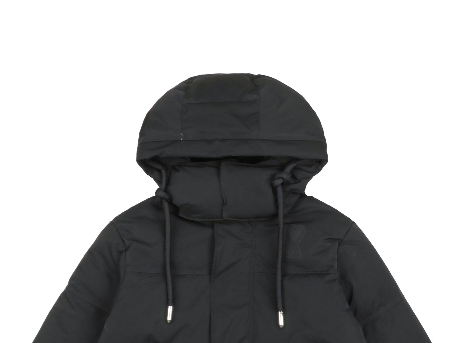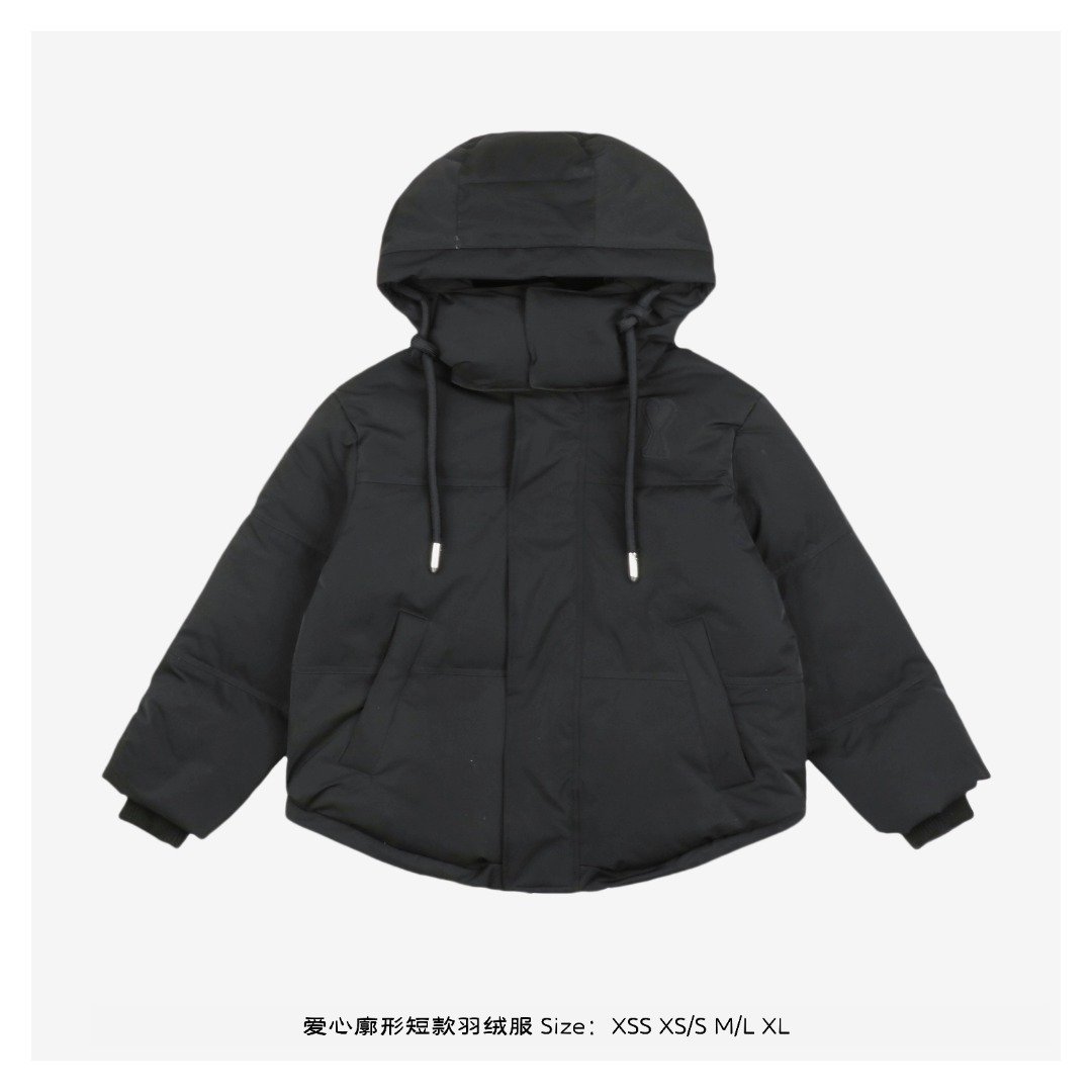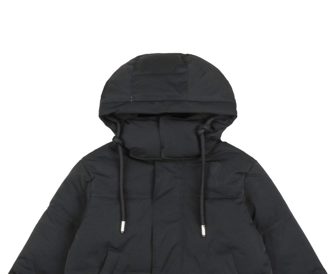 The outer fabric is made of double-layer lightweight bonded polyester fabric, and the lining is made of renewable microfiber. The overall fabric is soft, lightweight, windproof, waterproof, highly breathable, and warm. It features an oversized hood with custom-made 32-strand thickened drawstrings, a custom-molded bell-shaped hood, hand-stitched cuffs, and high-density knitted ribbed cuffs with a faux two-piece design. Color, size, and specifications are all accurate. The lining is filled with 50g of down, with an average fill weight of approximately 500g per jacket. All hardware is custom-molded and engraved. The placket features a white brass engraved YKK zipper, and the hem elastic adjustment buckle and drawstring holes are all engraved with AMI. The placket snaps are all COBRAX buttons. The accessories are of the highest quality, comparable to top-tier finishes. The left arm features a high-density AMI classic heart embroidery woven with a special dark blue-black yarn, not pure black. The neck label is a special beige woven fabric label, not a twill label. It has a double hangtag design, and all accessories are independently developed. The country of origin and washing label are located inside the lining pocket. The attention to detail is off the charts.