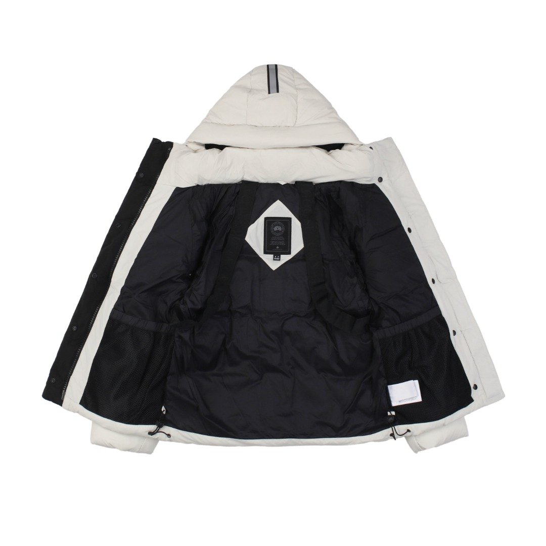 The fabric is made of Cordura nylon, enhancing the durability of easily worn areas. It is lightweight and durable. The inner lining uses 400T down-proof fabric, which is comfortable, soft, and prevents down leakage. The fabric is slightly waterproof with a lotus leaf-like water-repellent effect, allowing water to drip smoothly without lingering, easily handling extreme weather. The breathable lining prevents sweating and keeps the wearer dry and stable, providing greater softness and coverage around the head and neck. The high-neck windproof design provides extra protection against cold winds, ensuring warmth and comfort. It features a detachable, adjustable hood and is also filled with down. Fleece-lined fabric with an adjustable hood buckle. Multiple design elements lock in heat, providing greater softness and a snug fit around the head and neck for exceptional warmth. Large zippered pockets offer secure storage, while elastic cuffs prevent cold air from entering, maintaining a comfortable body temperature. The interior is filled with large, soft, and highly fluffy white duck down. The hood features reflective strips, an inner zippered placket with machine-embroidered shoulder straps, and an inner shoulder strap for easy carrying. A large elastic mesh pocket inside can hold various sizes of items. The simple, clean design is classic and timeless, offering both warmth and practicality.
