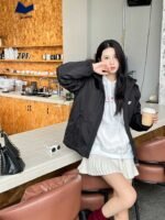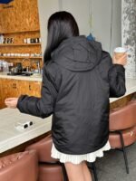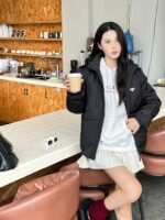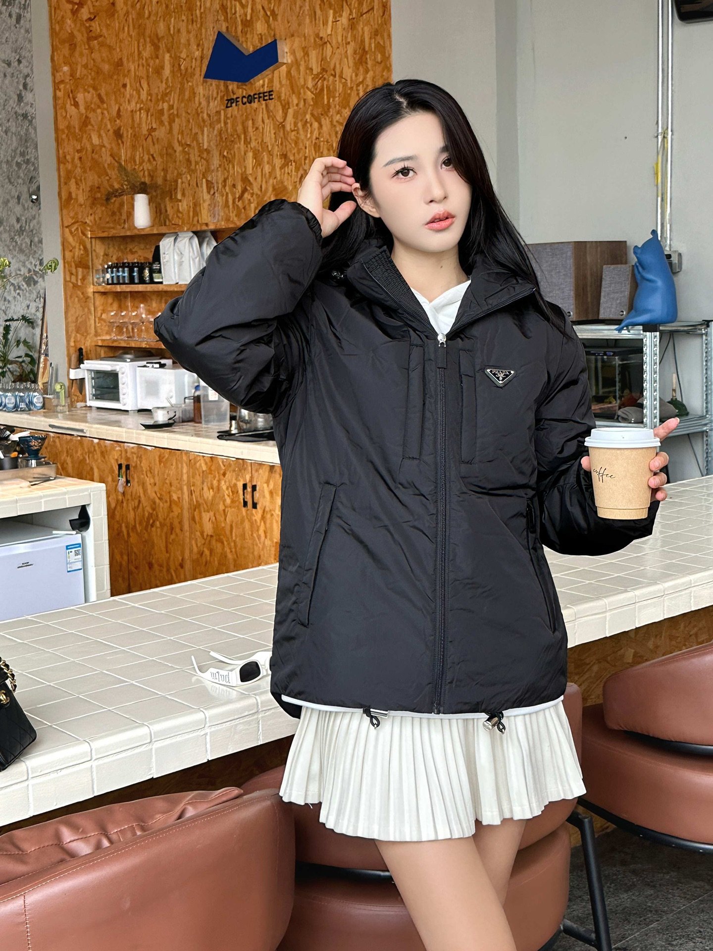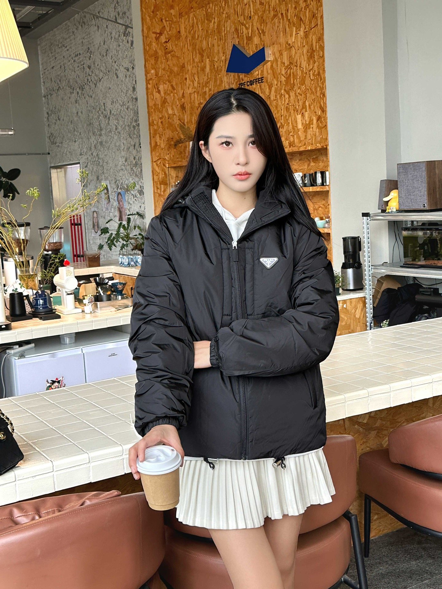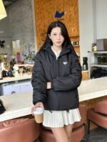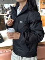 Prada/Prada down jacket with double chest pockets, fleece hood, how it looks on #