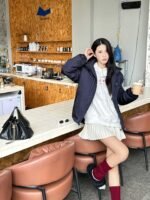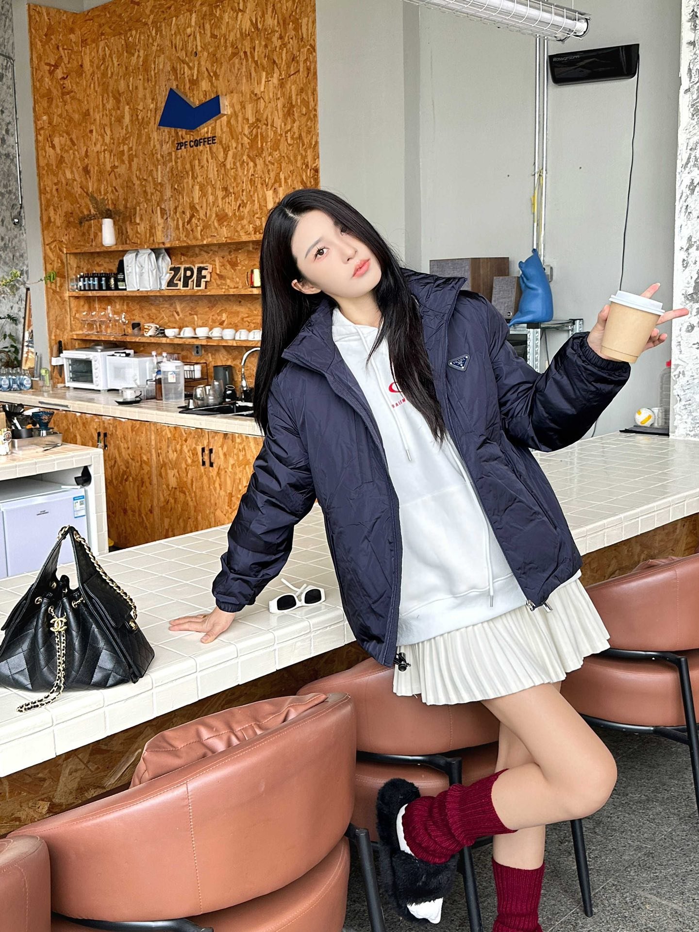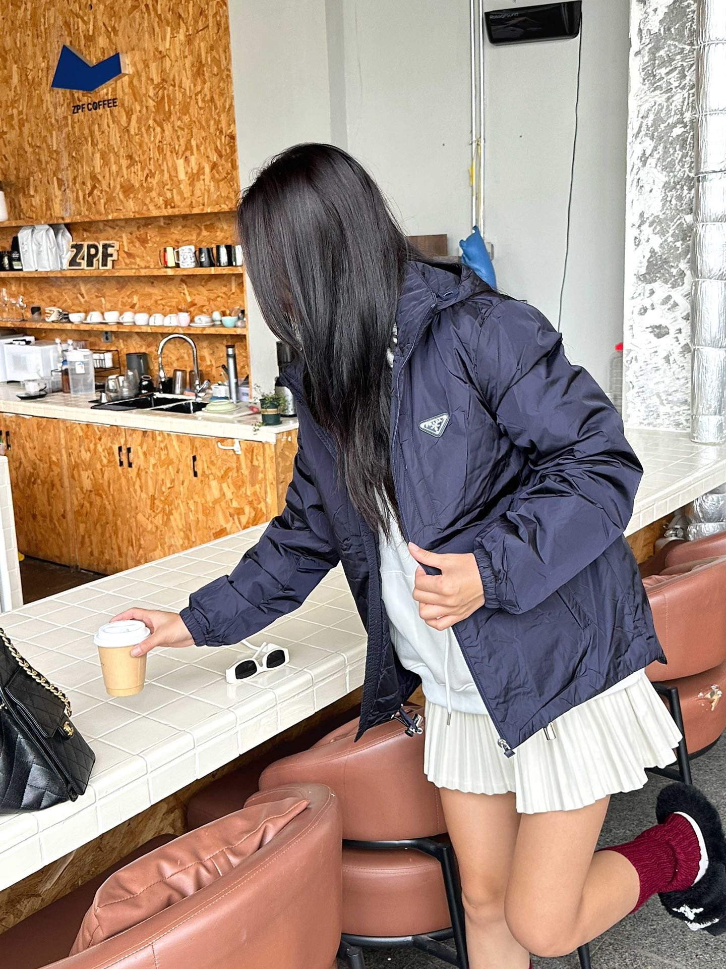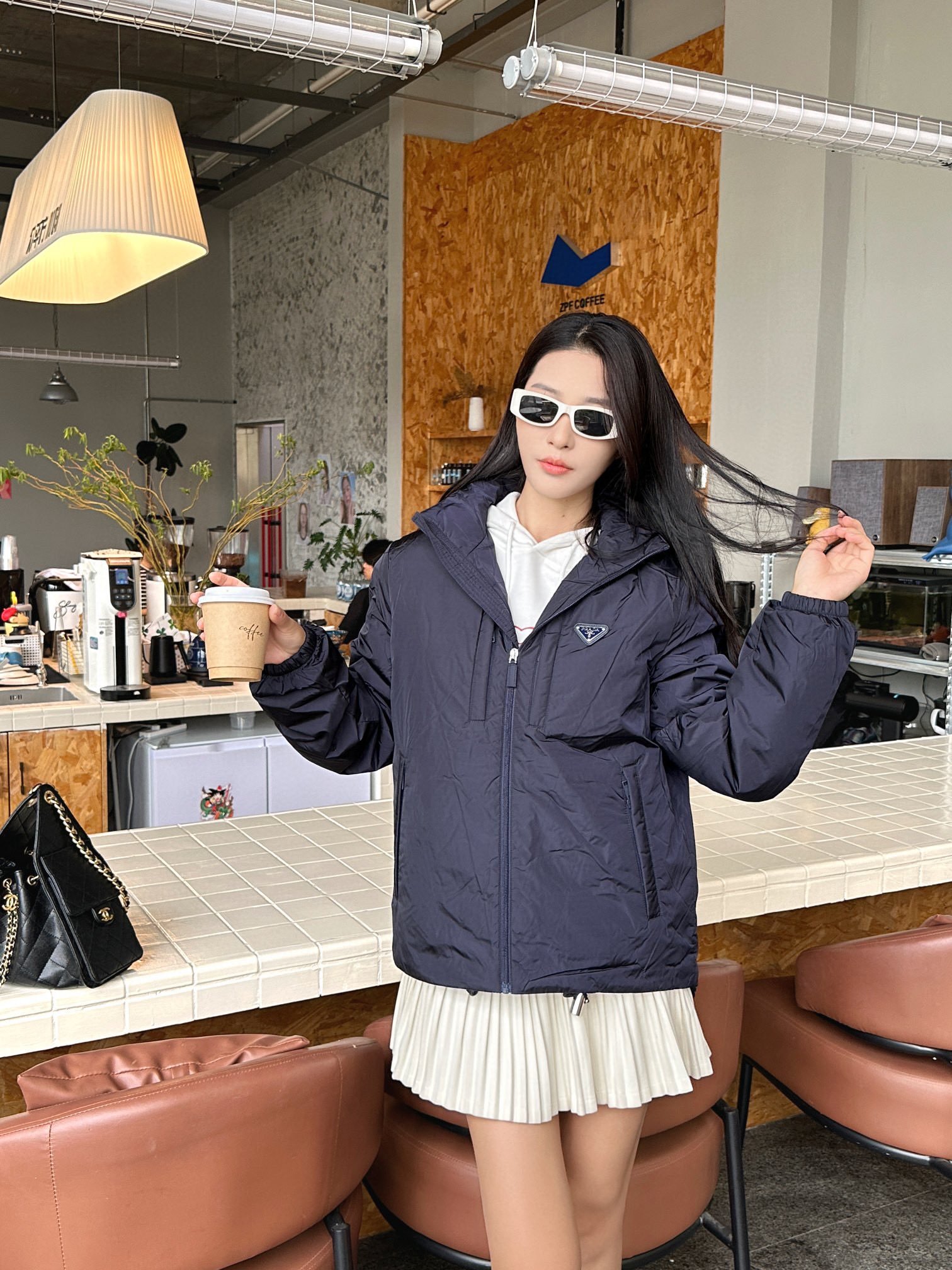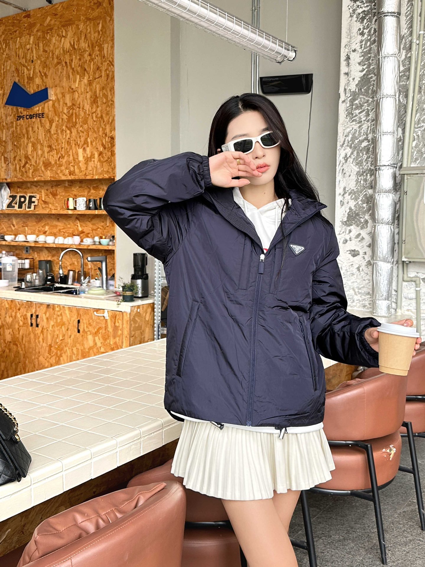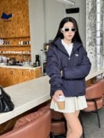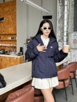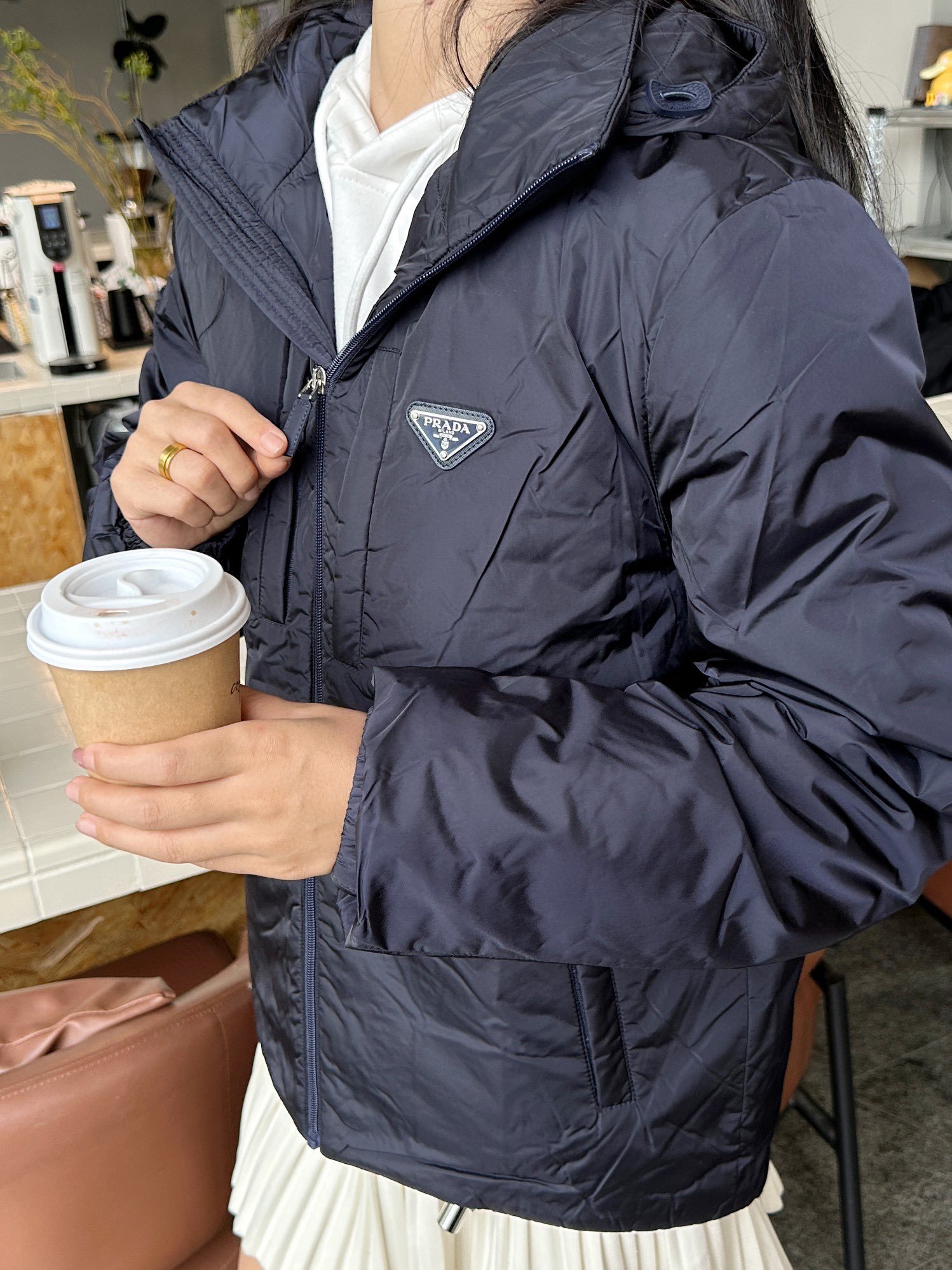 Prada down jacket with double chest pockets, fleece hood, and stylish fit. #