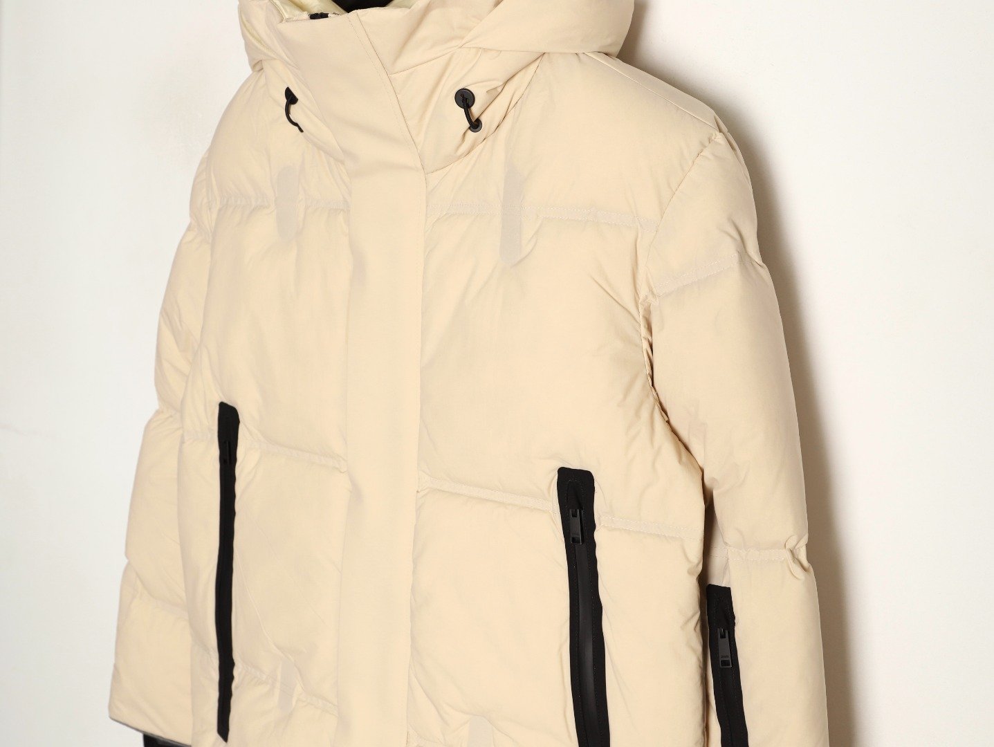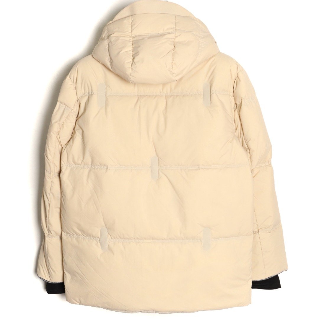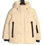‘s simple yet stylish design features large, laminated zippered pockets on both sides, making it easy to access essentials while adding a touch of style! The laminated pockets make the jacket more durable and less susceptible to wear and tear! The 3D laminated logo on the cuffs and webbing on the back collar are the finishing touches! These design details not only enhance the jacket’s stylish appeal but also become a symbol of luxury, making it a true statement piece that will make you stand out and become the center of attention! The jacket also features a turn-adjustable windproof hood, elastic ribbed cuffs, and a drawstring hem – all designed to withstand the elements, keeping you cozy and warm even in the coldest winter weather! These stylish touches balance warmth with warmth, ensuring you stay stylish while showcasing your unique style! Available in two colors: black and off-white!
