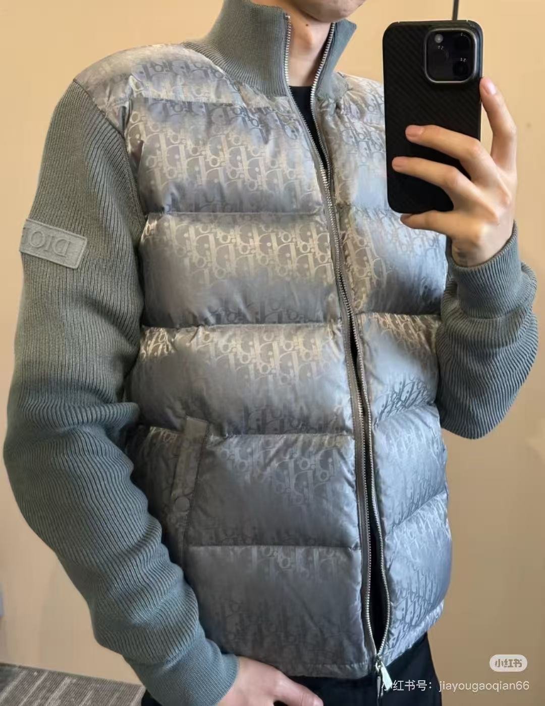 #Dior/Dior Oblique monogram all-over jacquard knit patchwork stand collar down jacket – how it looks on body