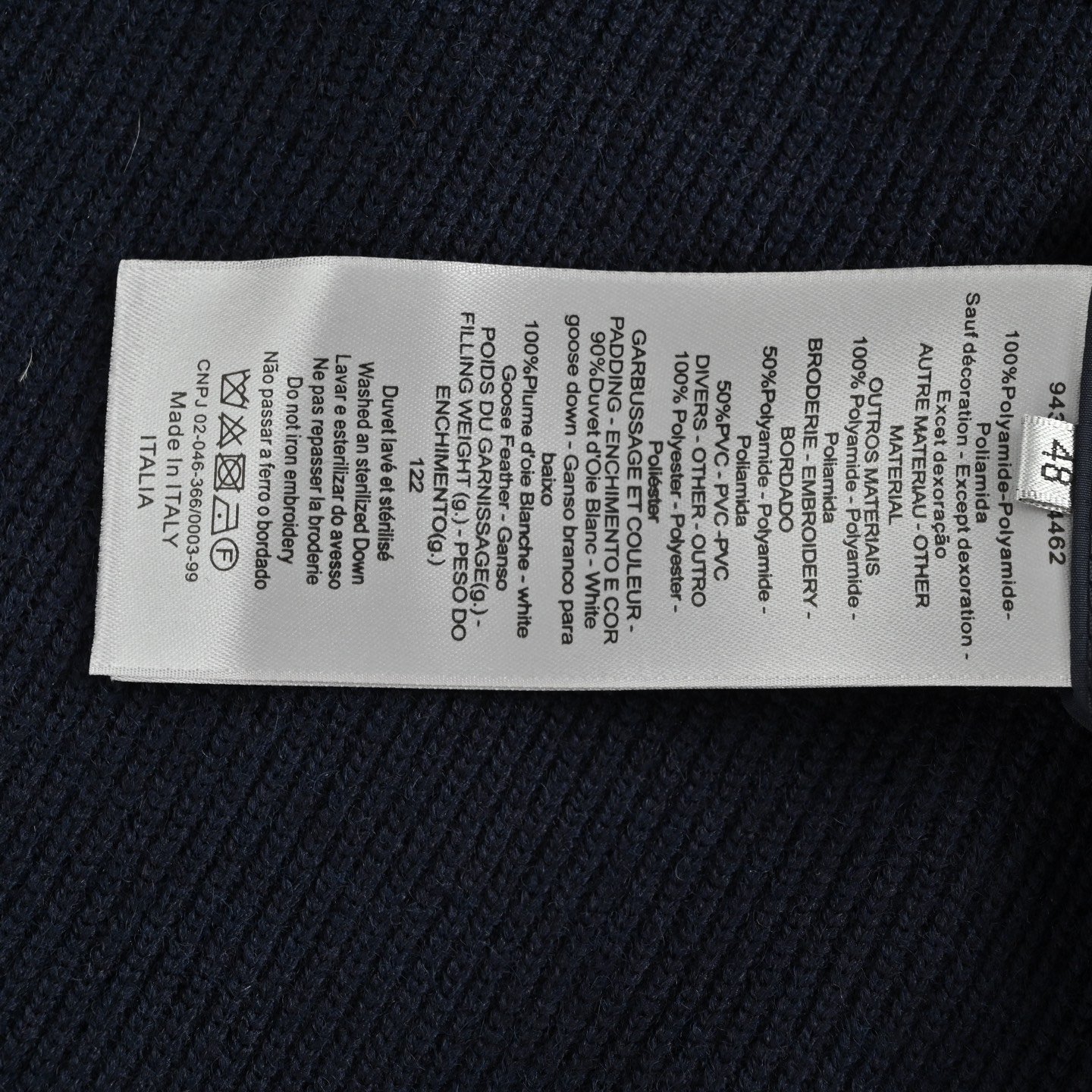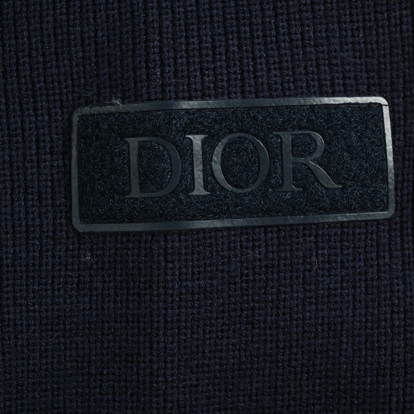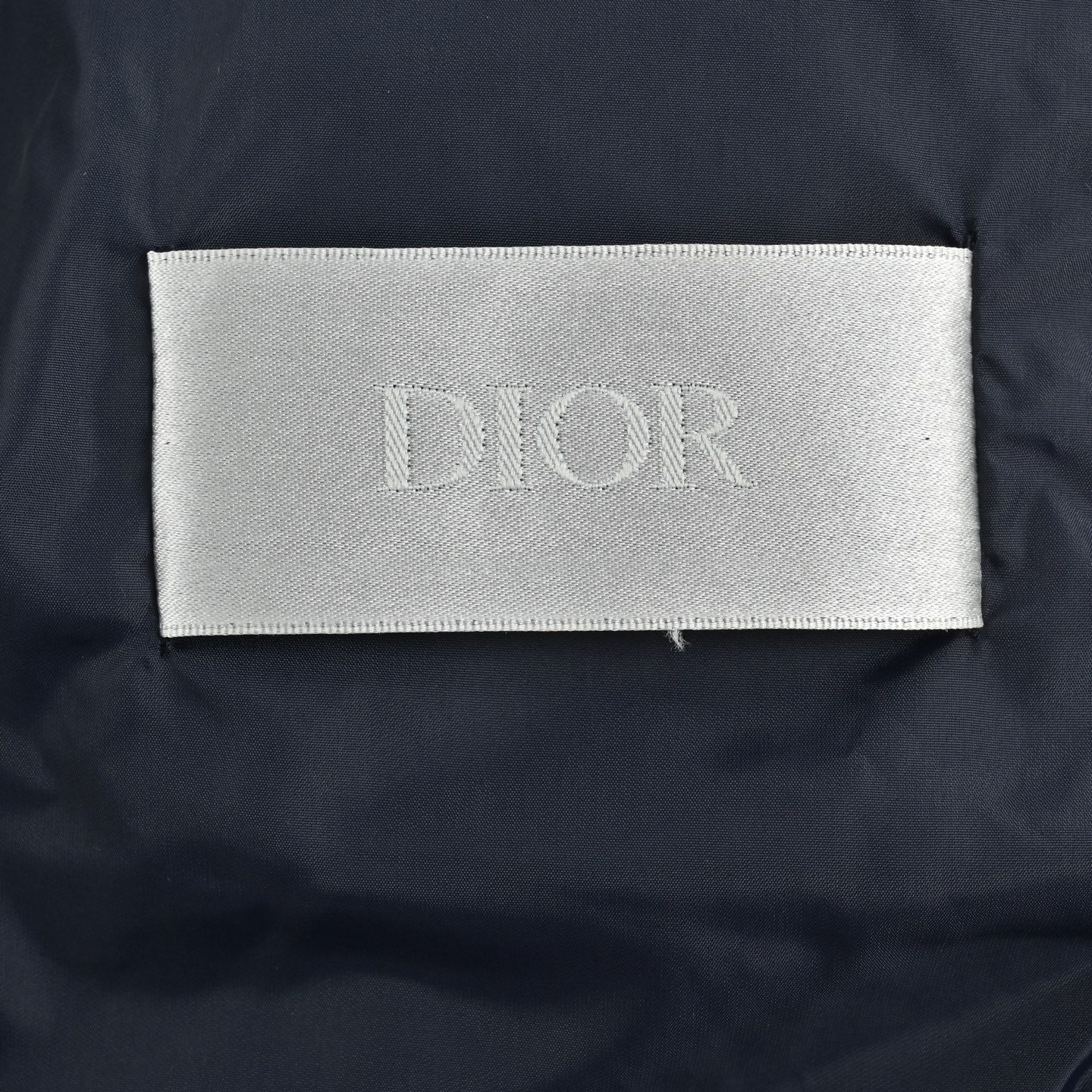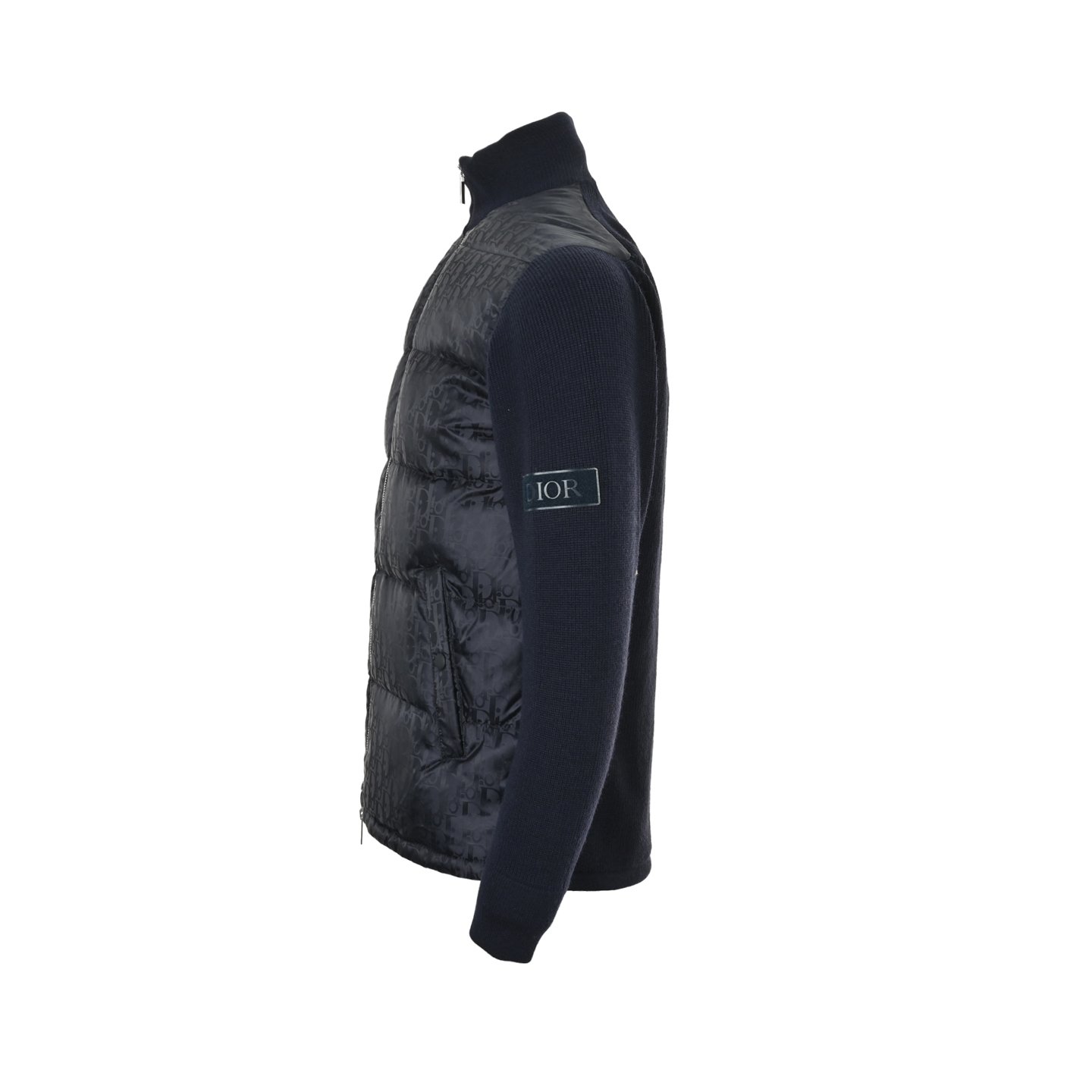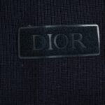 Logo: The left sleeve has a black Dior embroidered patch, and the zipper pull has a Dior stamped logo.