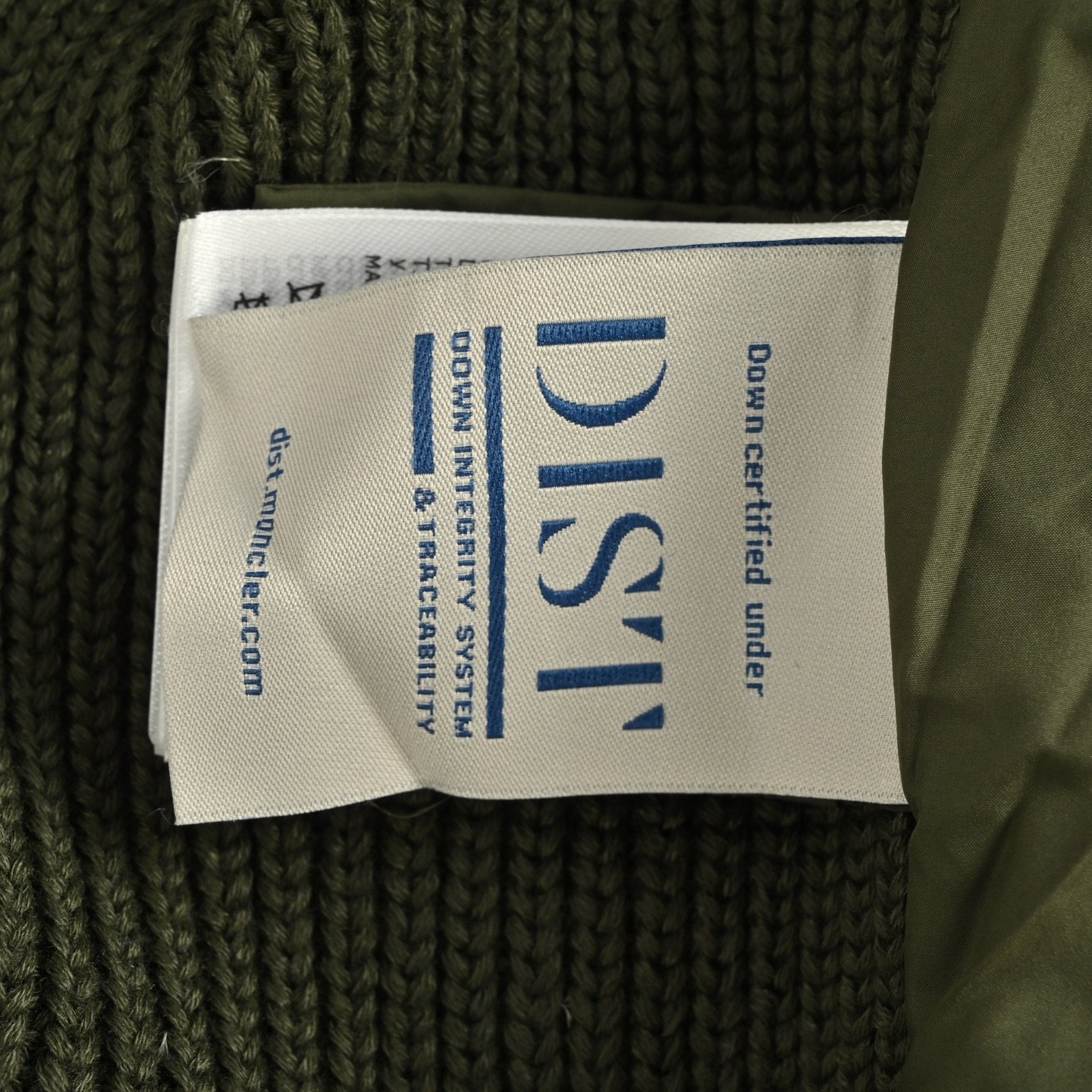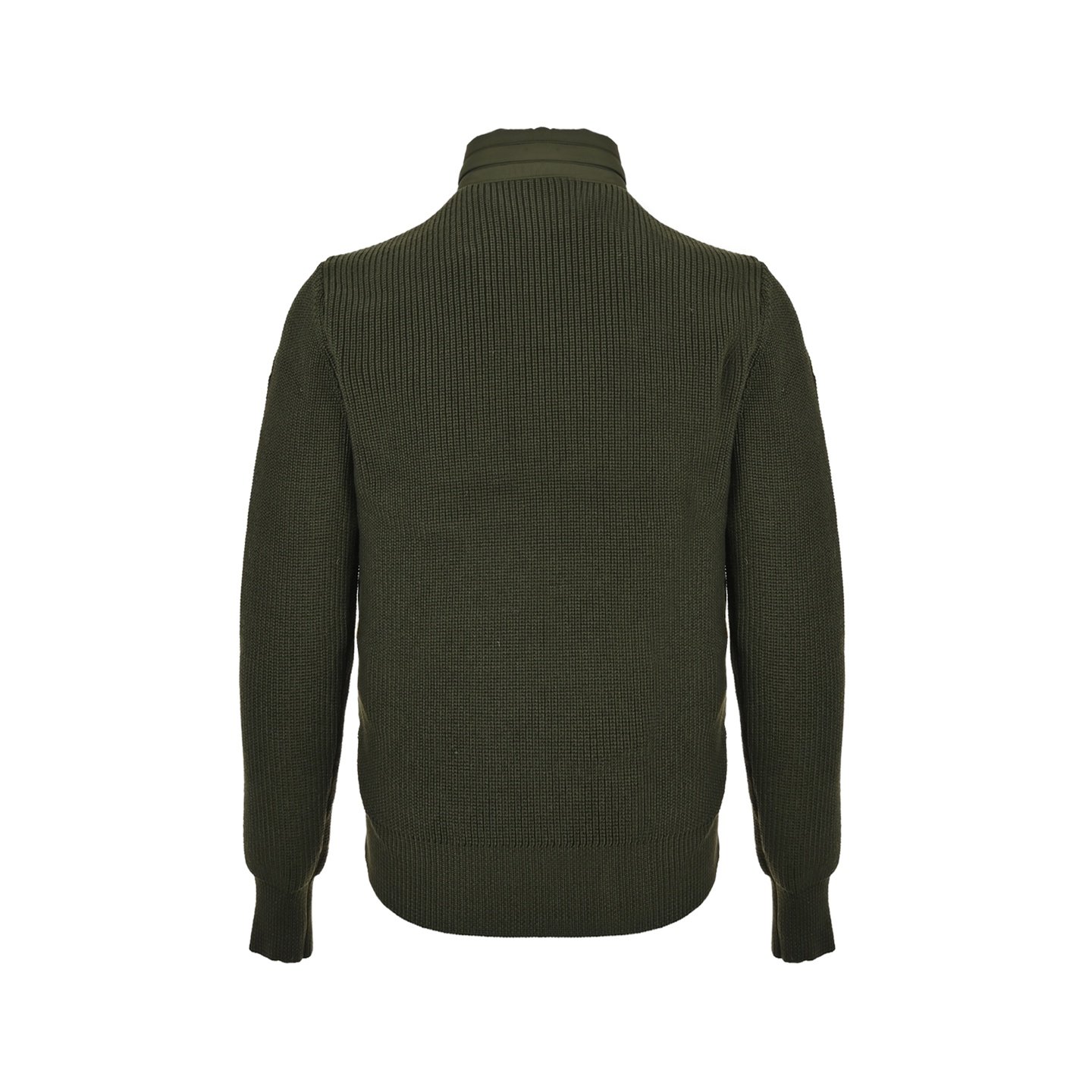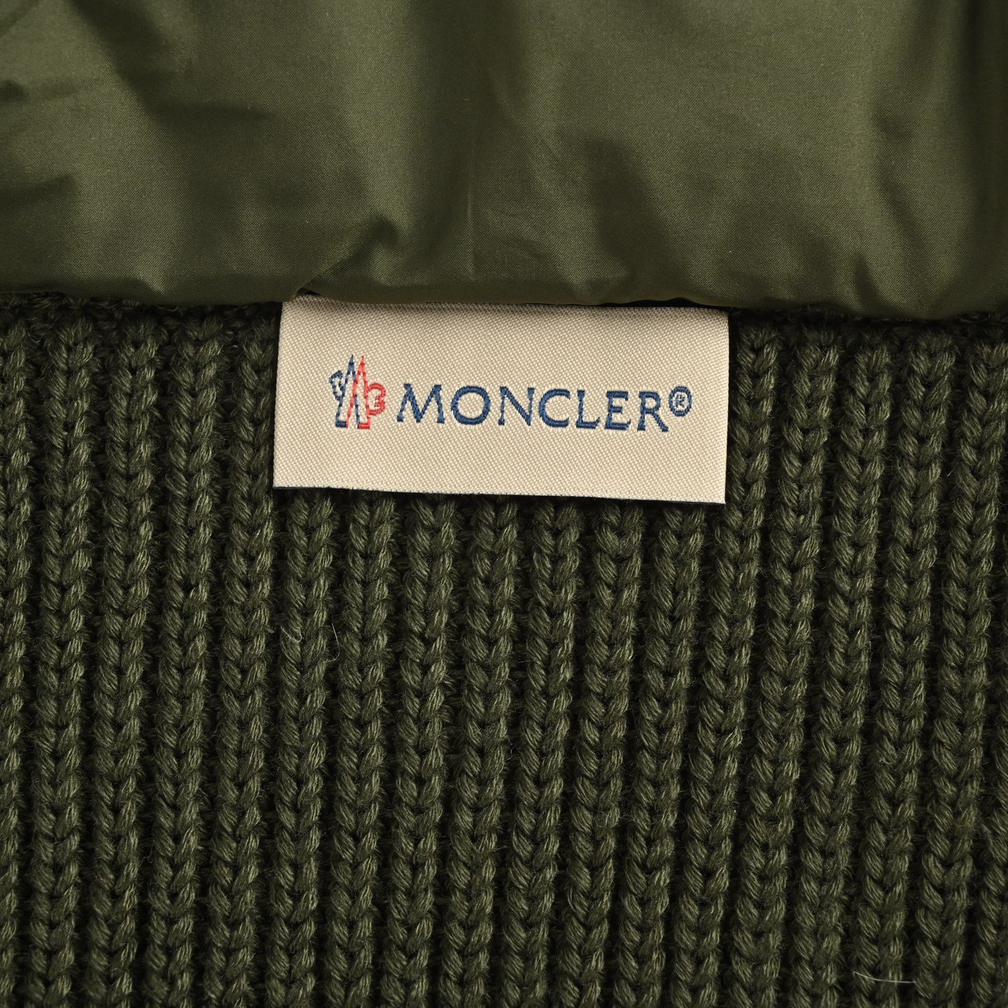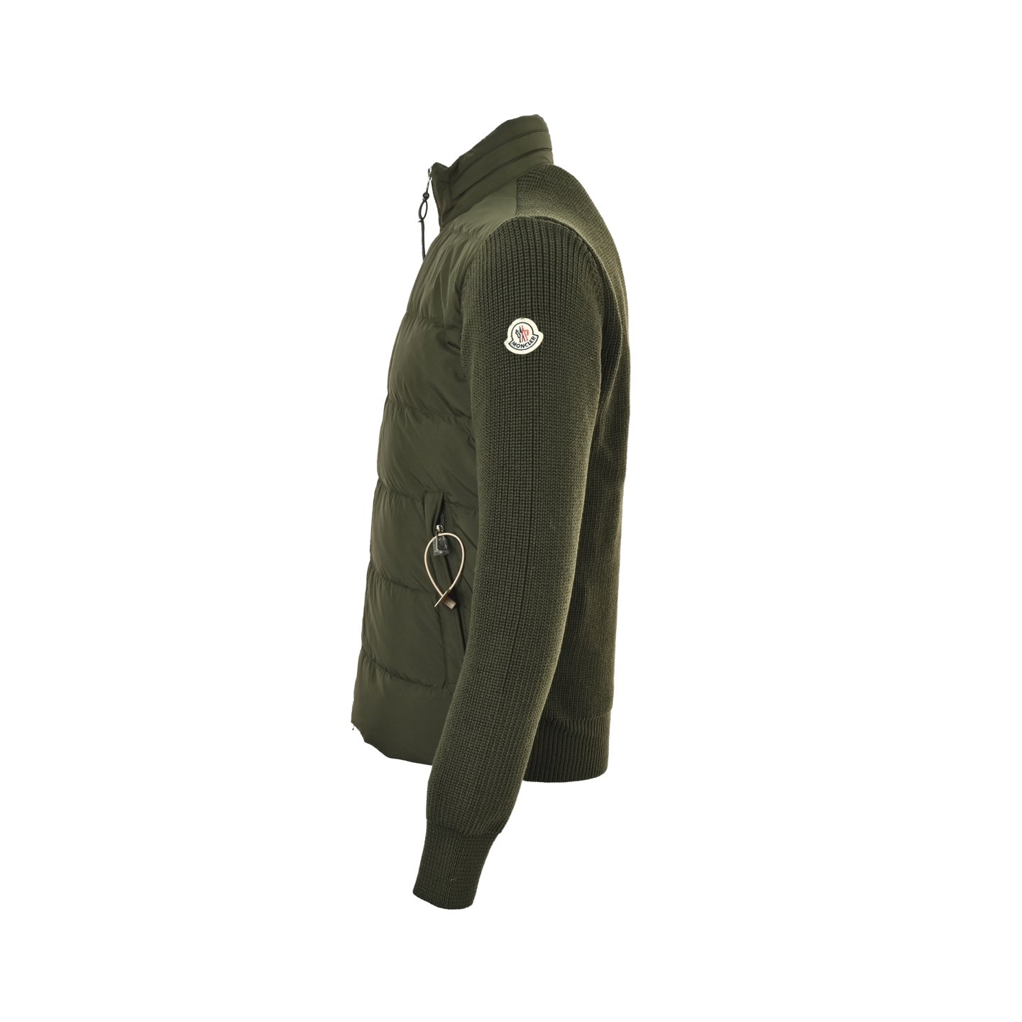 This wool cardigan features down filling. A classic Moncler design, it can be worn alone when the weather is pleasant, or layered with a jacket or coat when the temperature drops. The wool knit style and down filling on the front provide warmth and protection.