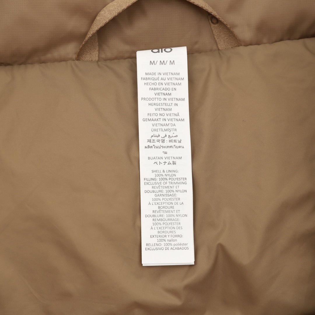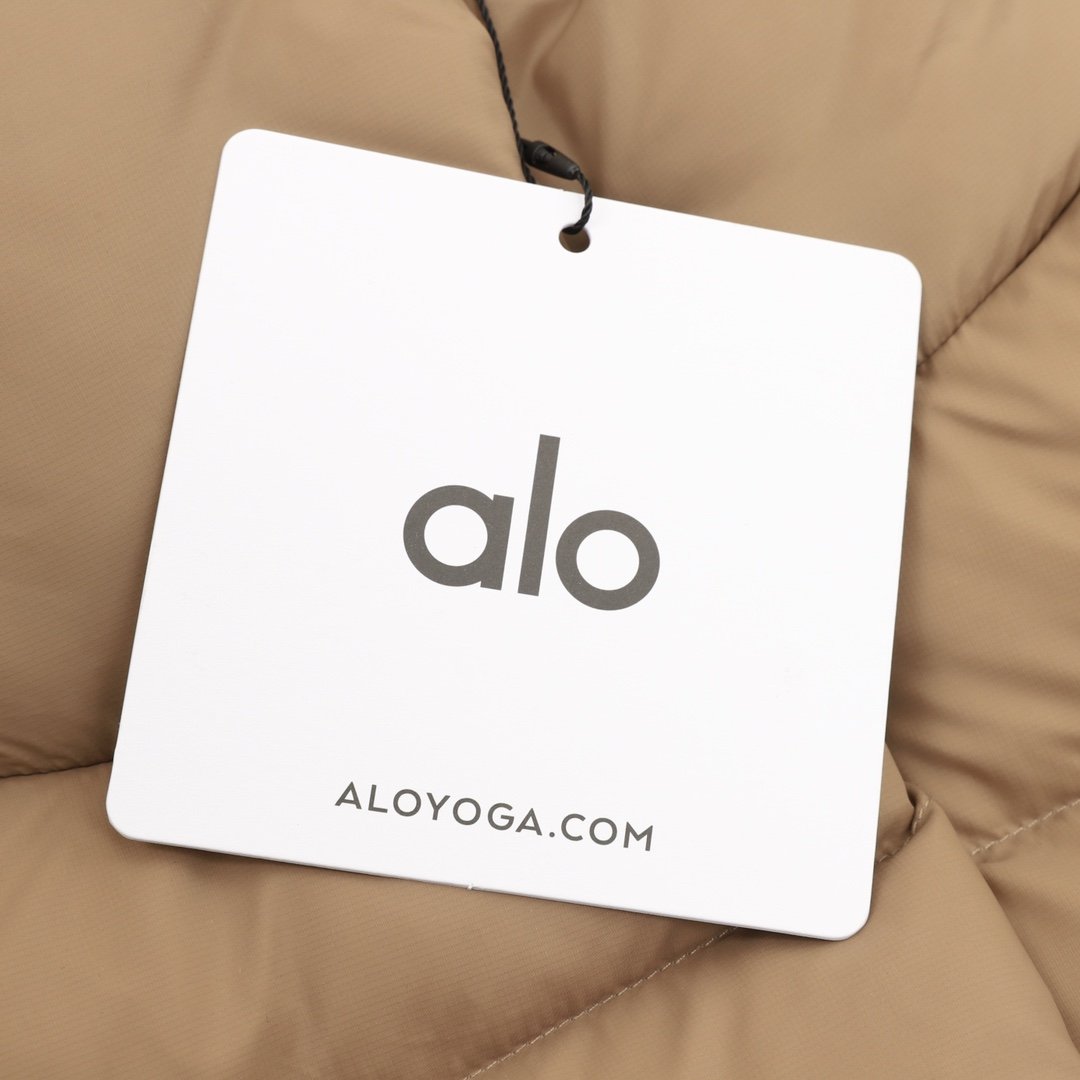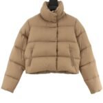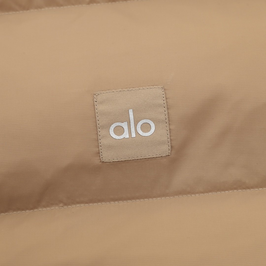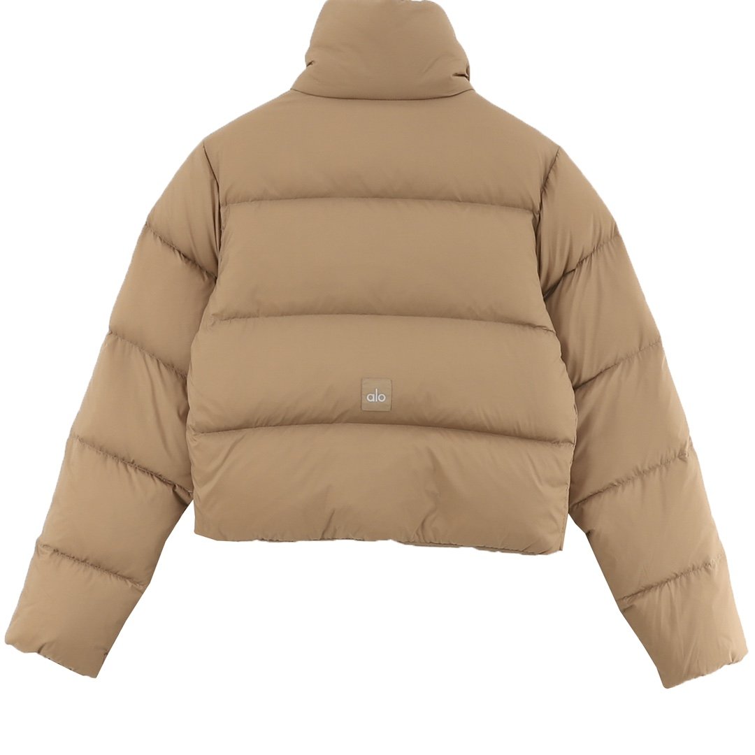 ALO yoga short down jacket with gold label and stand-up collar