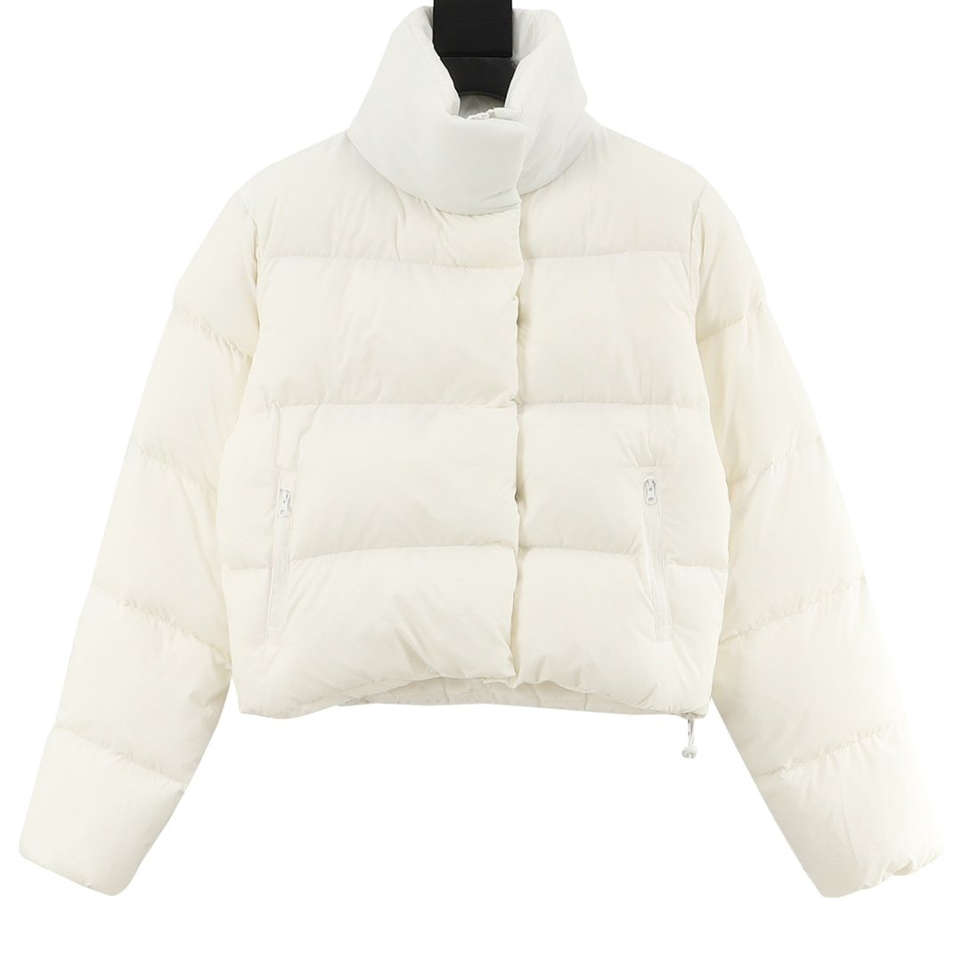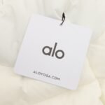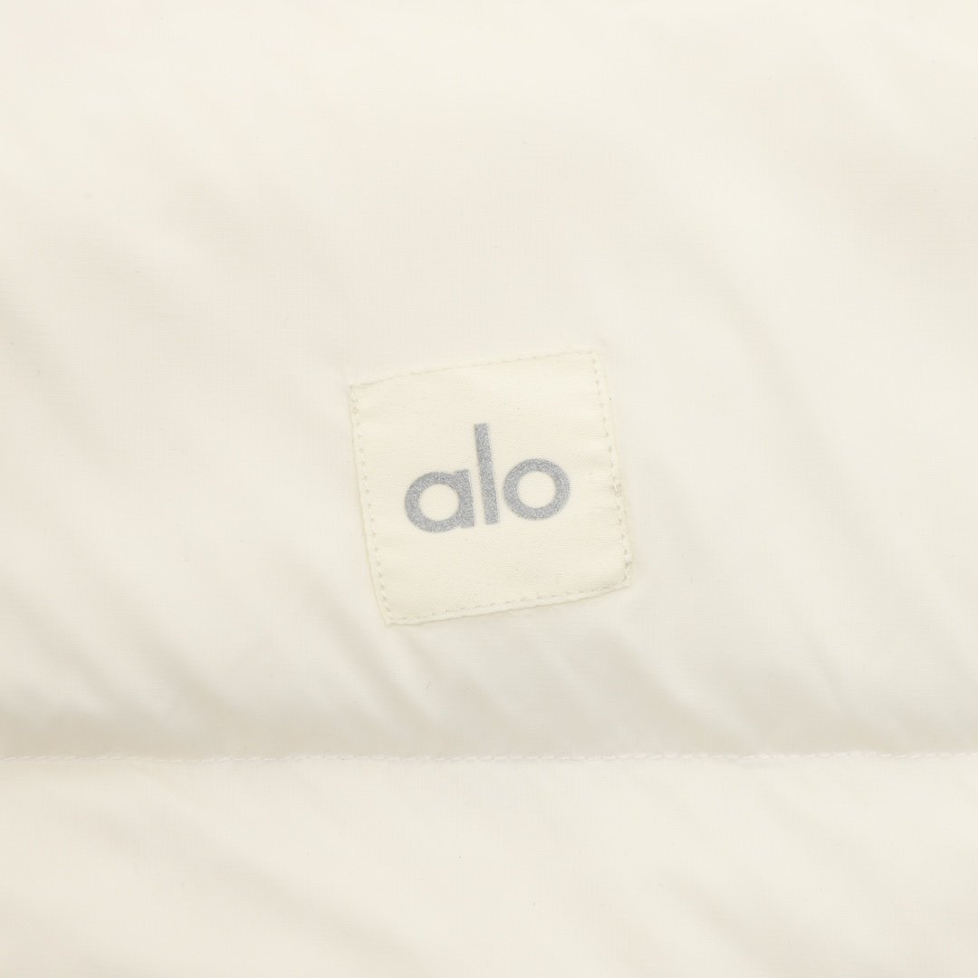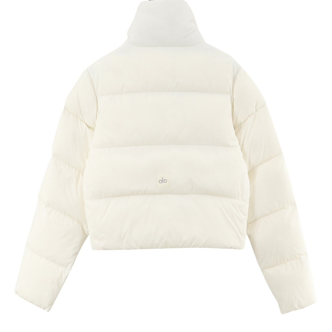 ALO yoga short down jacket with gold label and stand-up collar