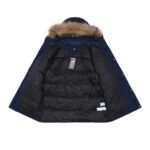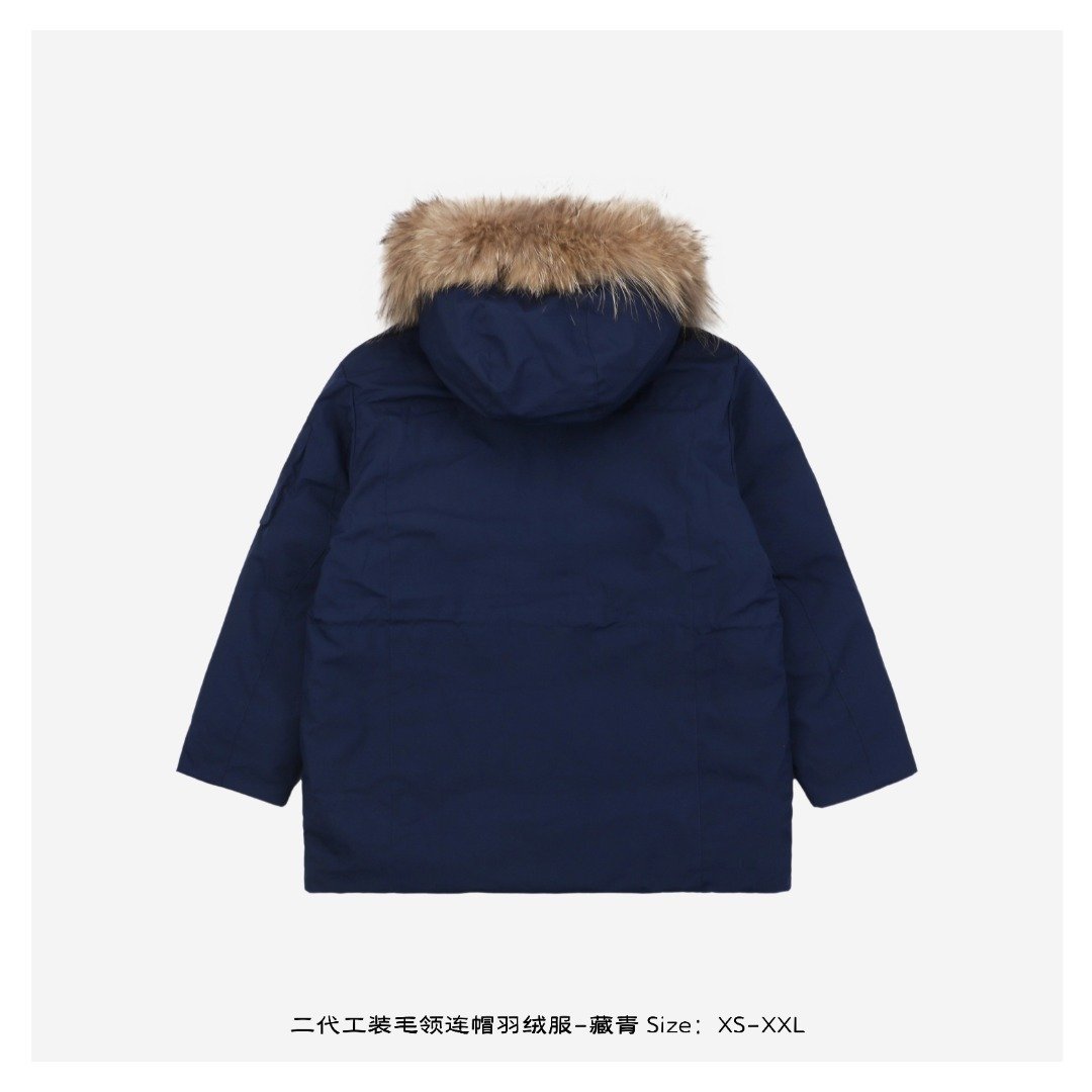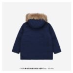 The second-generation workwear down jacket cleverly blends the brand’s deep baseball culture with modern street aesthetics. Its unique workwear design and relaxed fit make it stand out in winter wear, becoming a favorite among those seeking both quality and style. Filled with standard 50% white duck down, it boasts ample fill power, high loft, and superior warmth. The stand-up collar and hood design features a down-proof fleece trim at the collar; windproof cuffs effectively block cold wind; drawstrings at the waist and hem further enhance wind protection; and a double-layer down-proof lining provides superior wind resistance. The fabric is made of 100% polyester fiber, offering excellent waterproof and windproof properties. This fabric causes water to bead up and roll off, preventing penetration and keeping the lining dry even after splashes of water. The lining is also made of polyester fiber, soft and comfortable, and features a double-layer down-proof inner lining and upgraded down-locking technology to effectively prevent down leakage and ensure the down jacket maintains its excellent condition for a long time. It’s paired with a genuine raccoon fur collar, using fur from the raccoon’s back; the fur is abundant, long, smooth, and fluffy, providing not only excellent warmth but also adding a touch of style. The fur collar is also detachable for easy adjustment as needed. Unisex