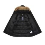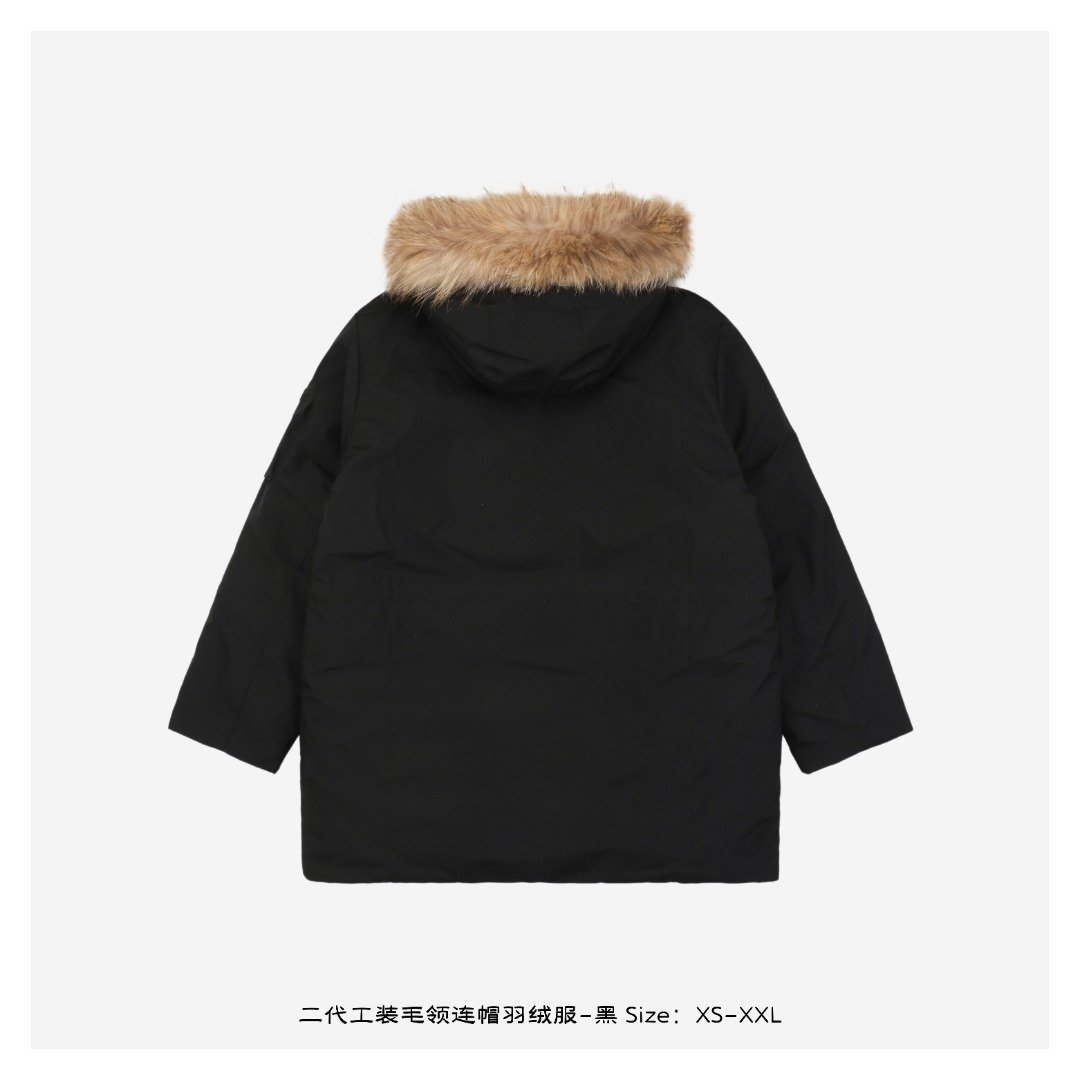 The second-generation workwear down jacket cleverly blends the brand’s deep baseball culture with modern street aesthetics. Its unique workwear design and relaxed fit make it stand out in winter wear, becoming a favorite among those seeking both quality and style. Filled with standard 50% white duck down, it boasts ample fill power, high loft, and superior warmth. The stand-up collar and hood design features a down-proof fleece trim at the collar; windproof cuffs effectively block cold wind; drawstrings at the waist and hem further enhance wind protection; and a double-layer down-proof lining provides superior wind resistance. The fabric is made of 100% polyester fiber, offering excellent waterproof and windproof properties. This fabric causes water to bead up and roll off, preventing penetration and keeping the lining dry even after splashes. The lining is also made of polyester fiber, soft and comfortable, and features a double-layer down-proof inner lining and upgraded down-locking technology to effectively prevent down leakage and ensure the down jacket maintains its excellent condition for a long time. It’s paired with a genuine raccoon fur collar, using fur from the raccoon’s back; the fur is abundant, long, smooth, and fluffy, providing not only excellent warmth but also adding a touch of style. The fur collar is also detachable for easy adjustment as needed. Unisex