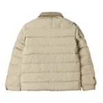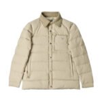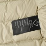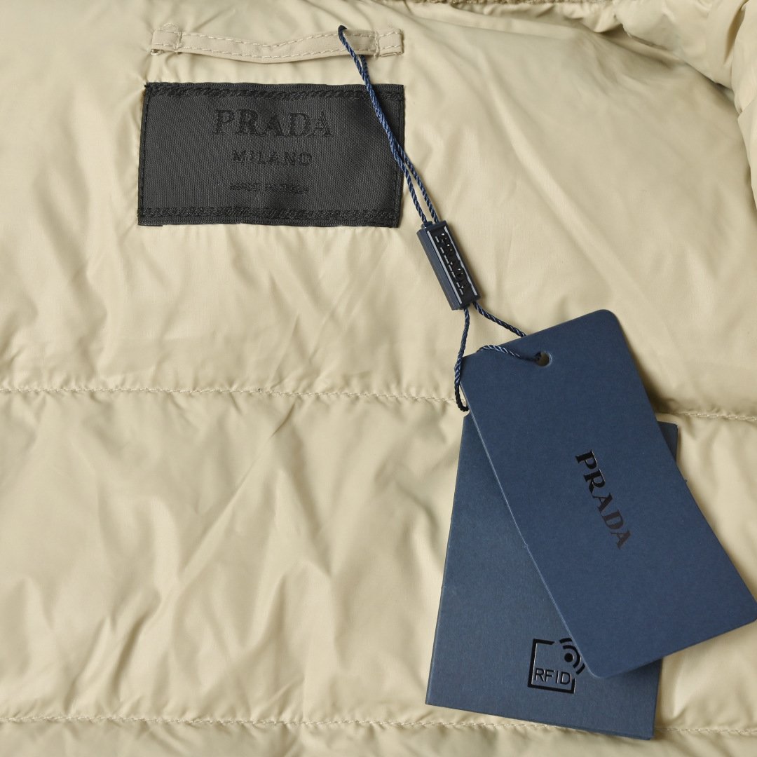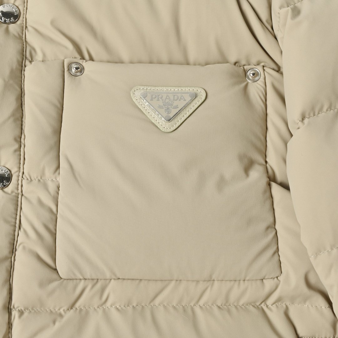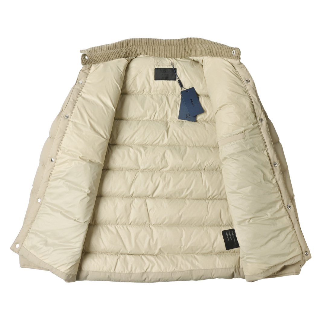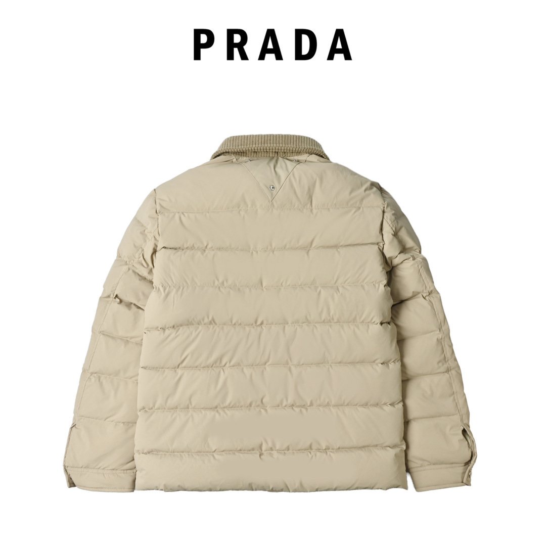 • Brand and design recognition: The enamel-coated classic triangle logo pocket on the chest is a signature element of Prada. The corduroy lapel forms a material contrast with the down body, showing the brand’s consistent light luxury tone.