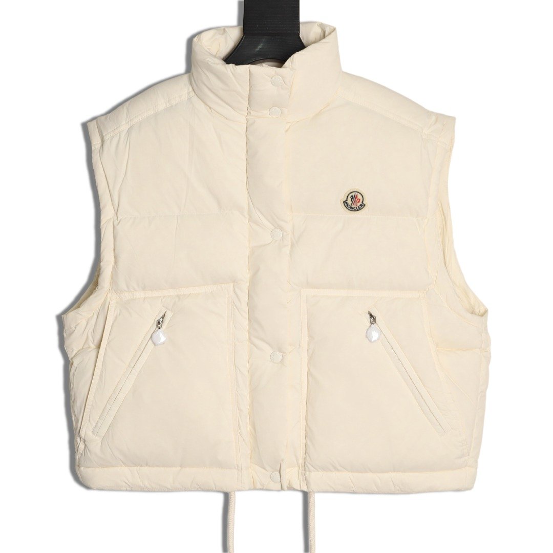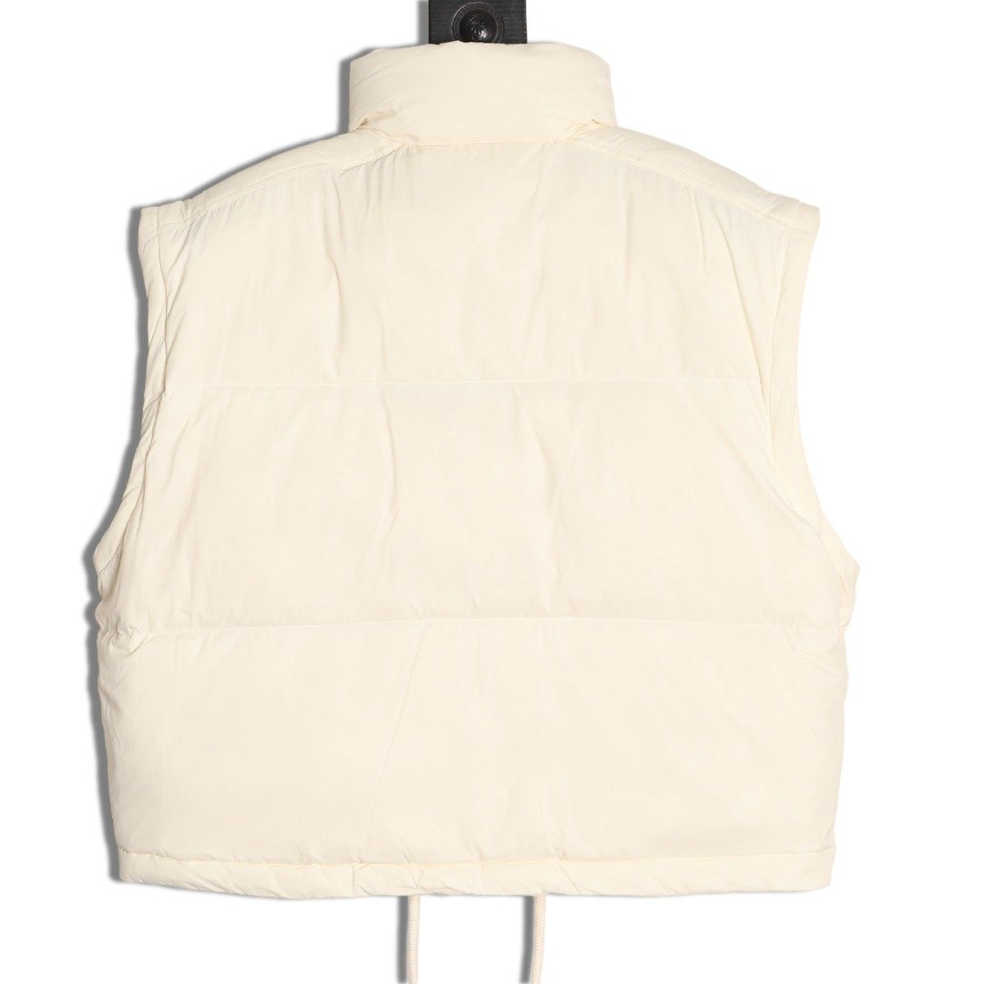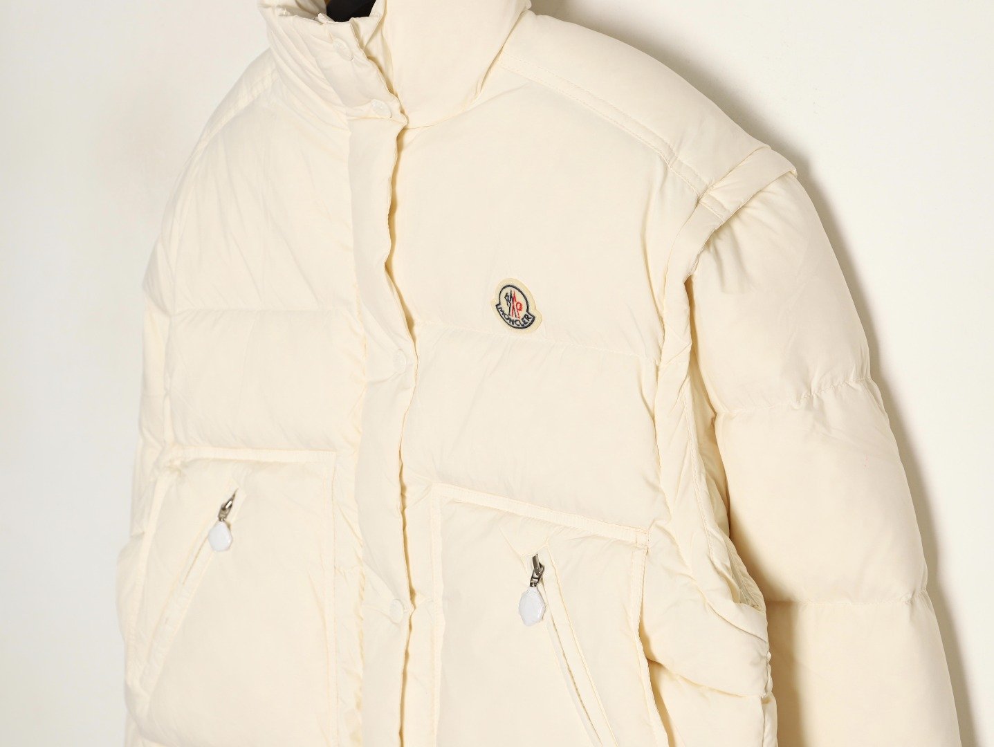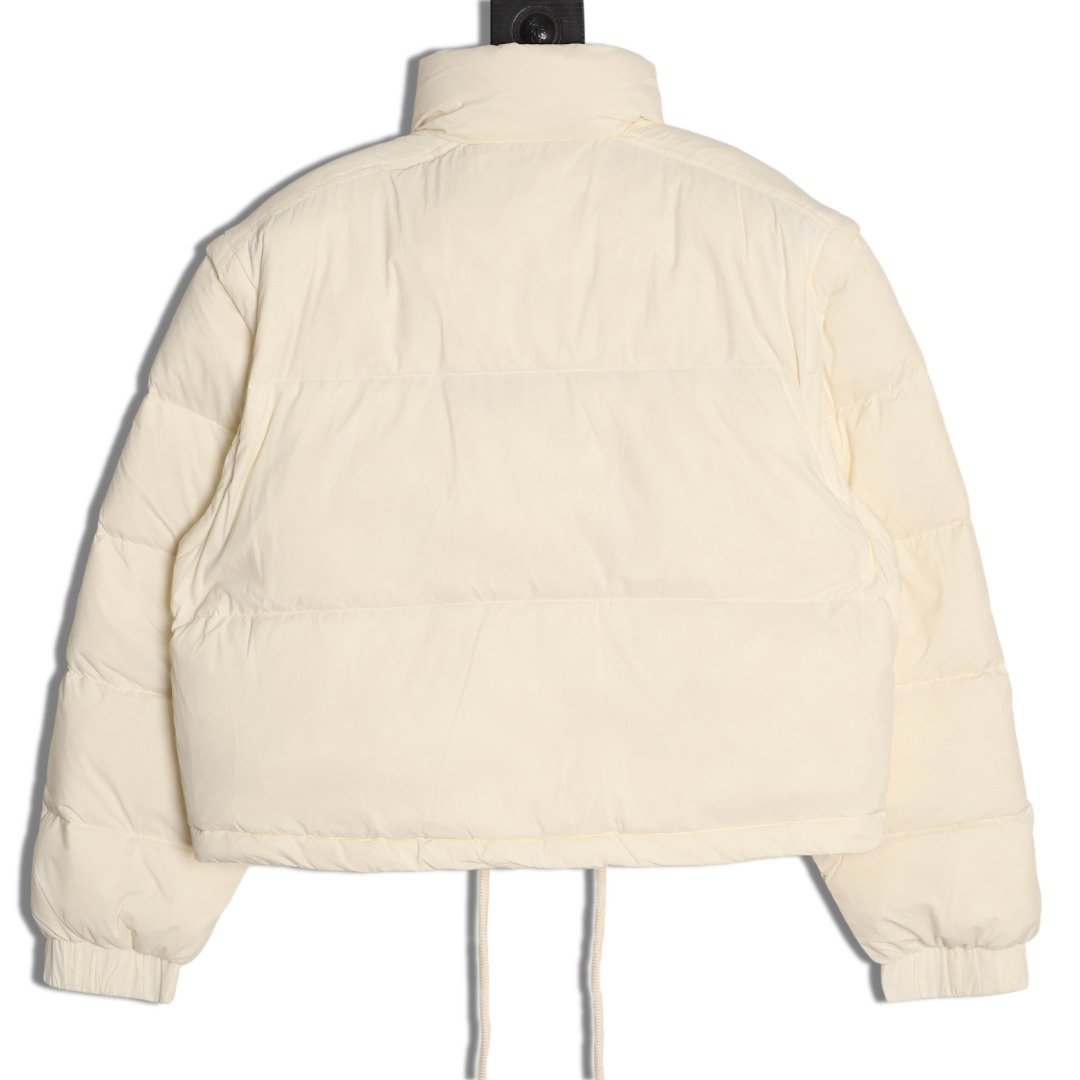 Removable sleeves, wide silhouette and short cut design, custom-made washed nylon fabric, Longuesaison lining, 90% down filling inside, hidden zipper closure with snap buttons, zipper pockets, elastic cuffs, drawstring hem. Camel and cream white