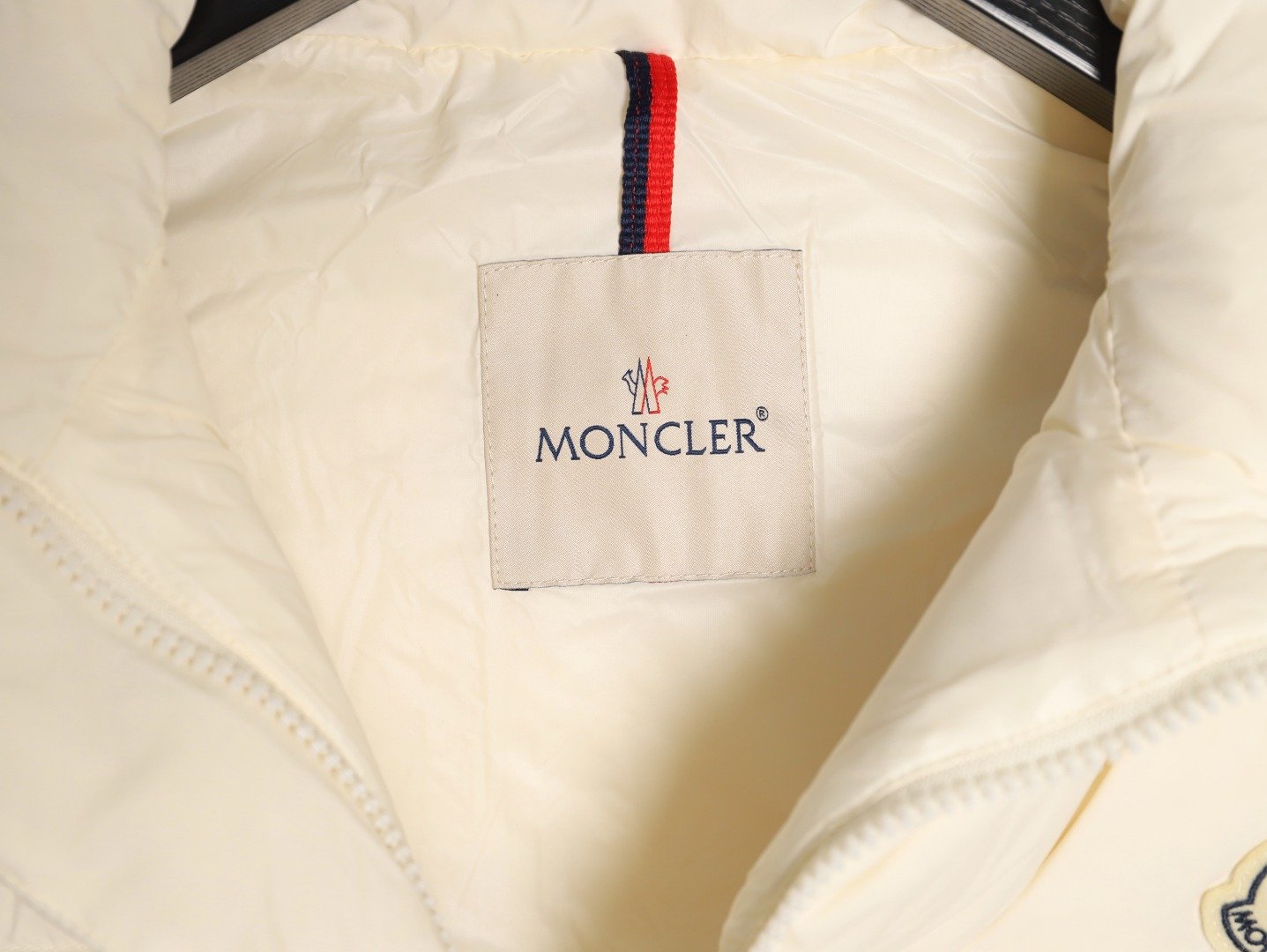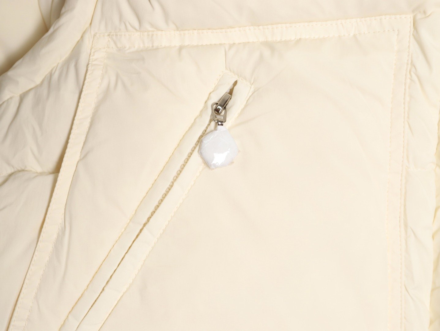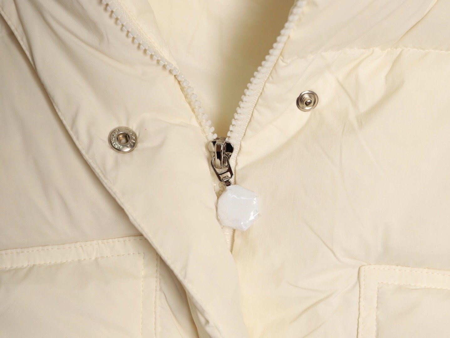 Removable sleeves, wide silhouette and short cut design, custom-made washed nylon fabric, Longuesaison lining, 90% down filling inside, hidden zipper closure with snap buttons, zipper pockets, elastic cuffs, drawstring hem. Camel and cream white