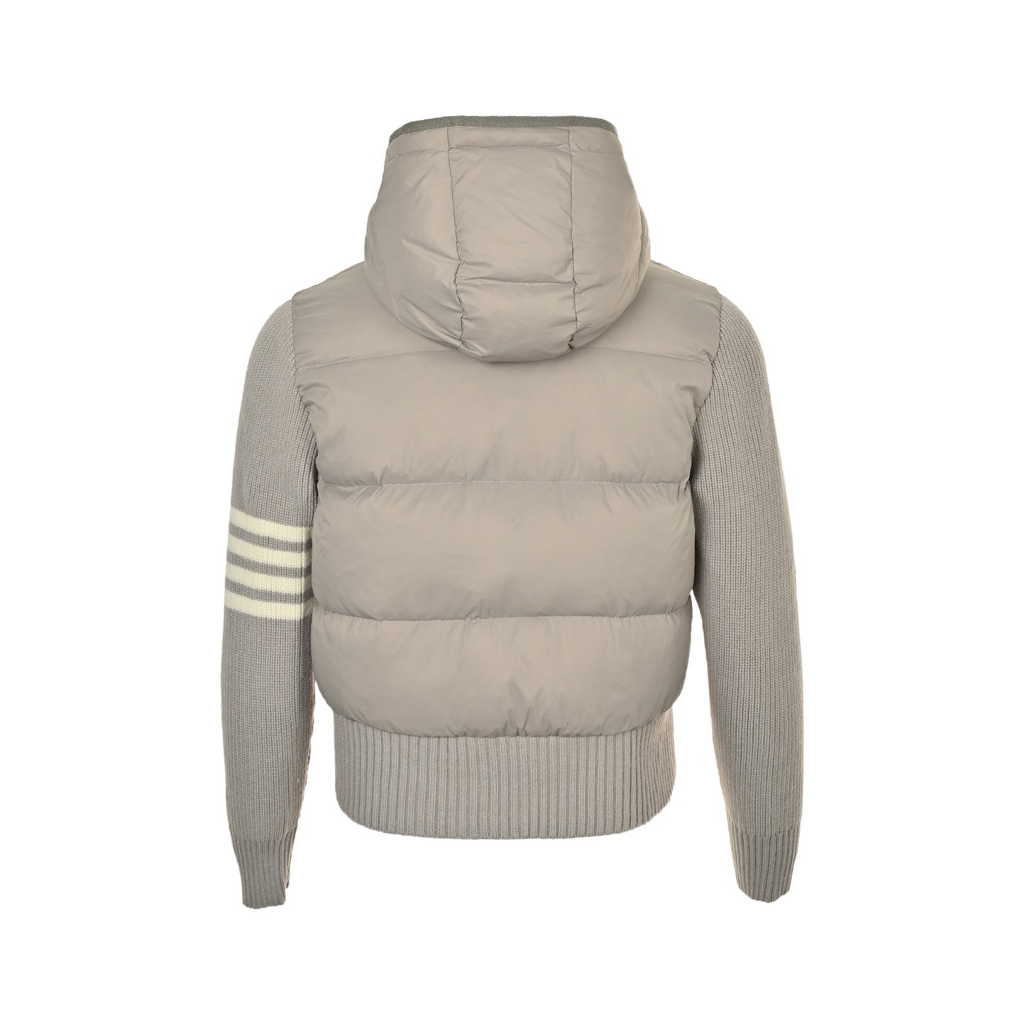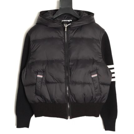 Thom Browne knitted patchwork four-stripe hooded 90s white duck down down jacket for women, casual preppy style
