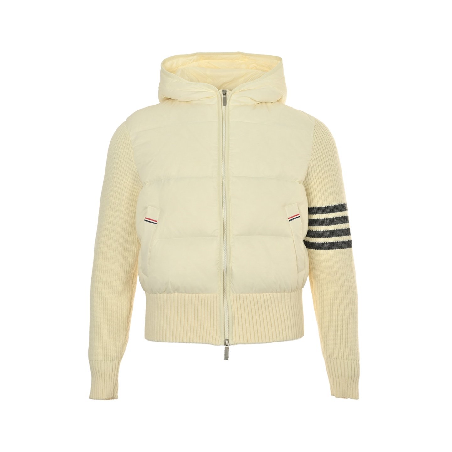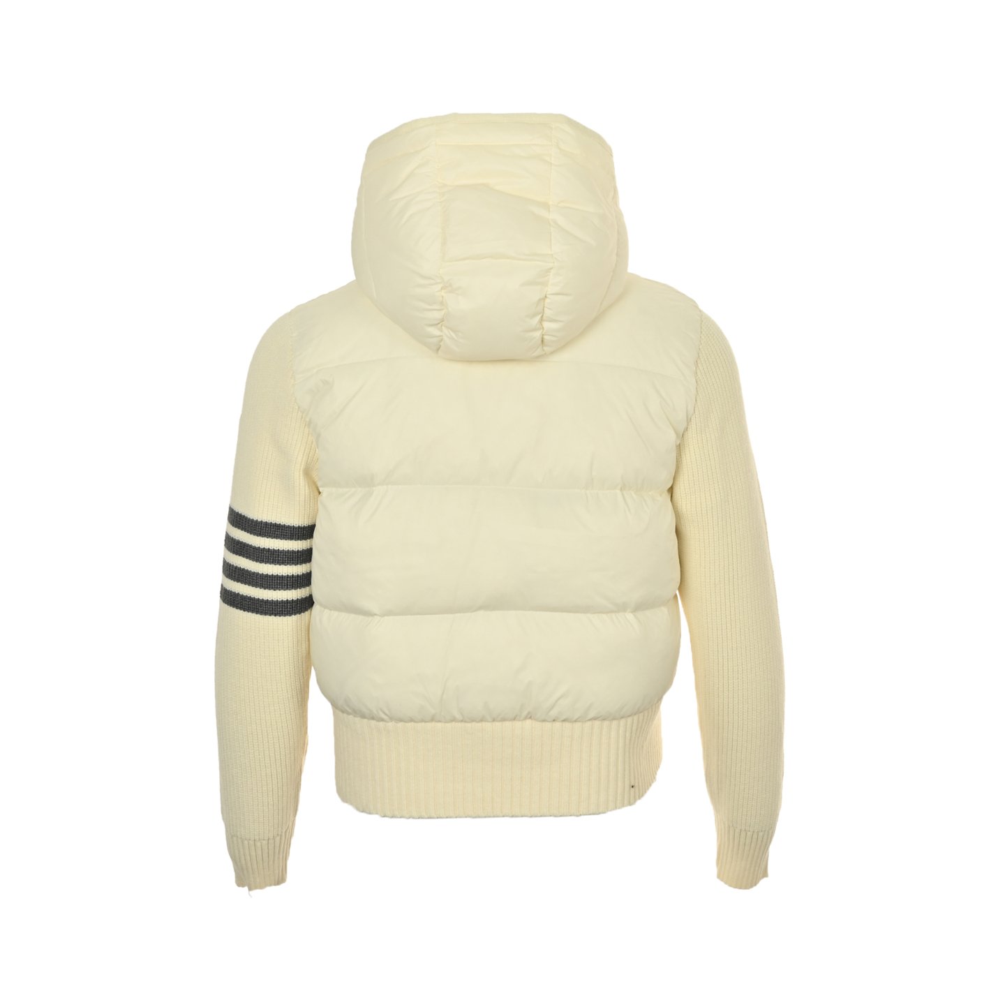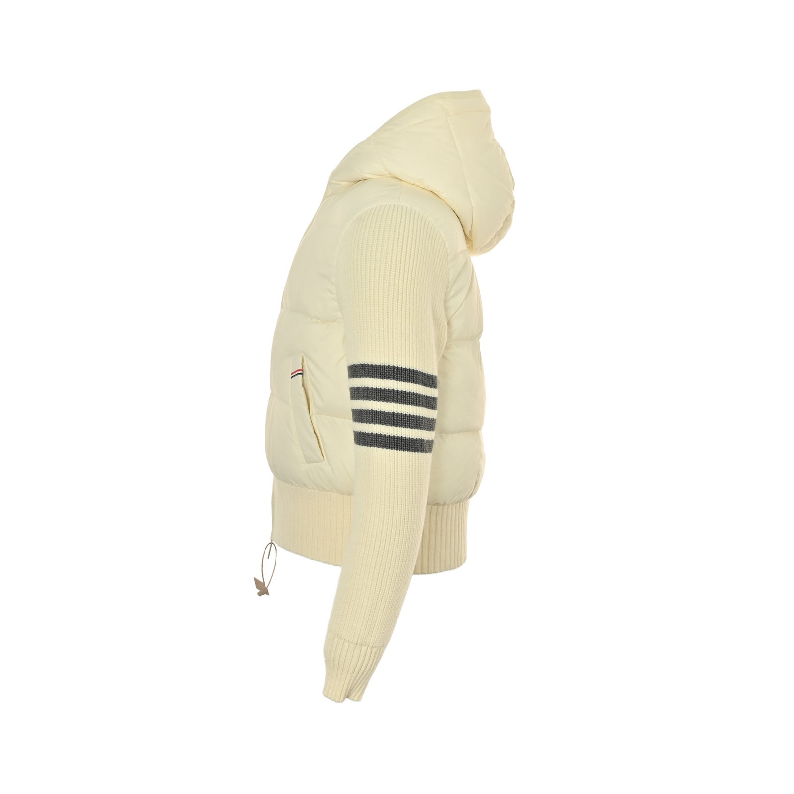 Thom Browne knitted patchwork four-stripe hooded 90s white duck down down jacket for women, casual preppy style