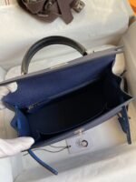 Hand-stitched Kelly 25cm Imported Epsom Leather Gemstone Blue with Black with French Blue Silver Buckle