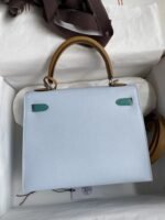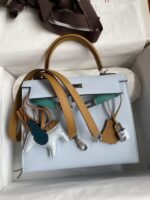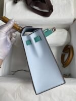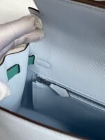 Do you have any questions about Hand-stitched ? Kelly 25cm Imported Epsom Leather Haze Blue Patchwork Verona Green Patchwork Sesame Silver Buckle?