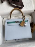 Hand-stitched ? Kelly 25cm Imported Epsom Leather Haze Blue Patchwork Verona Green Patchwork Sesame Silver Buckle