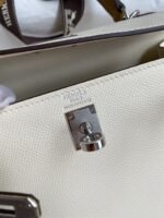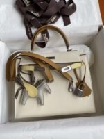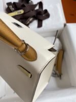 Hand-stitched ?Kelly 25cm Imported Epsom Leather Triple Patchwork Colors Cream White/Chicken Yellow/Sesame Seed Silver Buckle