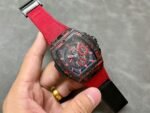 The BIG BANG Soul Red Carbon Fiber watch is in a bold red color that creates a stunningly strong visual impact. The internal mechanics of the watch are clearly visible through the transparent case, while the red hands and hour markers give the entire surface a strong sense of rhythm and architecture, demonstrating the extraordinary appeal of time. The 30-minute and 12-hour counters at 3 o’clock and 6 o’clock, respectively, can individually record up to 11 hours, 29 minutes and 59 seconds, and the seconds counter at 9 o’clock, with three dials and hands also in red, echoing the red Hublot logo at 12 o’clock.