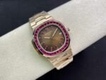 Patek Philippe Nautilus 5723 1:1 Superclone modified with rubies 18k gold wrapped is a unique and eye-catching timepiece. It features a 40mm stainless steel case with an Olive Green dial , a bezel set with rubies and wrapped in 18K Gold. The hands and hour markers are also made of rubies, and the watch is powered by the Patek Philippe Caliber 324 S C automatic movement.