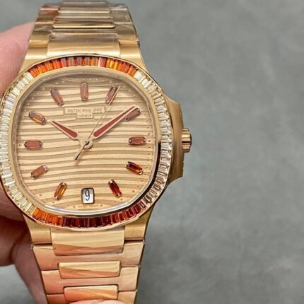 Patek Philippe Nautilus 5723 1:1 Superclone modified with rubies 18k gold wrapped is a unique and eye-catching timepiece. It features a 40mm stainless steel case with an Olive Green dial , a bezel set with rubies and wrapped in 18K Gold. The hands and hour markers are also made of rubies, and the watch is powered by the Patek Philippe Caliber 324 S C automatic movement.