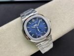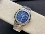 Patek Philippe Nautilus Annual Calendar 5726. It is a high-quality 1:1 Superclone of the original Patek Philippe Nautilus Annual Calendar 5726. The watch has a stainless steel case, a blue dial, and a self-winding movement. It is water resistant to 120 meters.