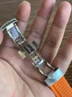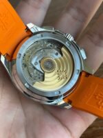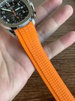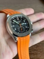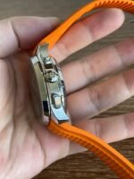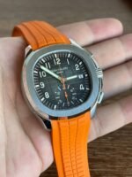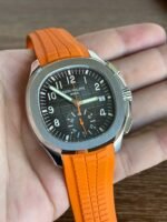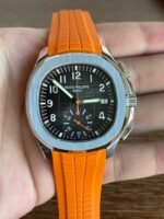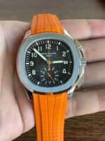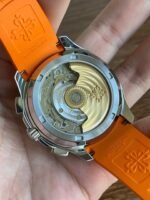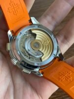 Colored dial and colored tape, the chronograph seconds hand and scale in the center of the dial and the 30-minute counter at 6 o’clock, as well as the chronograph hands, are all orange, and the tape is also orange (the tape is available in both black and orange) Patek Philippe CH28 chronograph movement is self-winding, column-wheeled, vertically clutched, and has a flyback function The 6 o’clock counters have a 60-minute counter and a 12-hour counter, which are set together (the 60-minute counter is on the outer ring, the 12-hour counter on the inner ring). The 6 o’clock chronograph has a 60-minute counter and a 12-hour counter, both of which are integrated (the 60-minute counter is on the outer ring and the 12-hour counter on the inner ring).