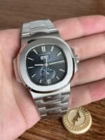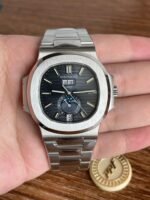 The Nautilus series has always been designed with a rotating window shape case, PPF and the authentic craftsmanship consistent with the use of wrought grain finishing and polishing process processing constitutes a stark contrast, 1:1 restoration of every detail of the authentic. Plate deep blue and decorated with horizontal horizontal embossed pattern color spread from the center to the surrounding area, week month double window and date window black letter white background recognition, 24-hour display plate comes with a moon phase is very elegant, the overall feeling is unique and elegant, is one of the most beautiful Nautilus. Back sapphire mirror, equipped with PPF’s exclusive R & D 324S QA LU 24H/303 automatic integrated mechanical movement, 21K large gold tourbillon to make winding more efficient, ruby bearings below the Geneva grain of the fish scale pattern is exquisite, movement polishing is still the industry benchmark level. As PPF’s first annual calendar watch, it can correctly identify the small and large months, and the date only needs to be adjusted once a year on March 1st.