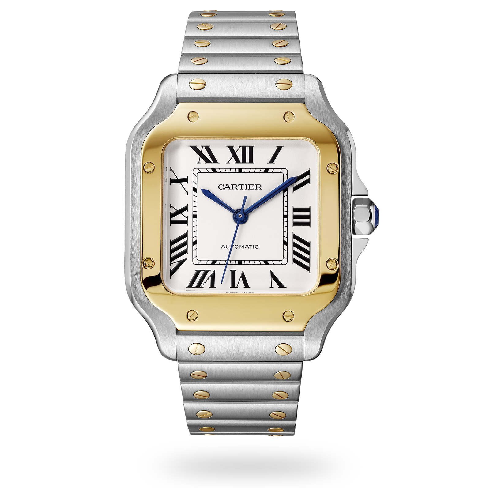 replica Santos de Cartier watch, Medium model, automatic, yellow gold and steel, two interchangeable straps