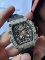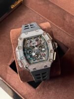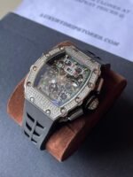 case: titanium made silver tone case with diamonds mounted perfectly all over the case making this top quality Iced Richard Mille RM011-03 1:1 clone too blingy!