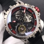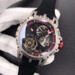 The BBR Roger Dubuis King Series Titanium Tourbillon Model: RDDBEX0479 is a high-end Superclone watch that is made to resemble the original Roger Dubuis King Series Tourbillon watch. It has a titanium case that is 45mm in diameter and 13.5mm in thickness. The watch is powered by a seagull custom RD505SQ winding movement, which is accurately adjusted in six directions and has a power reserve of up to 50 hours. The dial is hollowed out and features a luminous scale, black DLC coating, and a second dial in layered titanium. The hands are covered with a luminous coating for easy and clear reading. The watch is also equipped with a sapphire crystal glass with anti-glare coating and a natural rubber strap imported from Germany.
