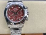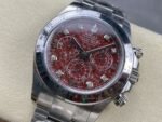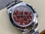 Here are some of the specifications of the Rolex Cosmograph Daytona 1:1 Superclone with a red pomegranate, funa stone, and pan di tong dial: