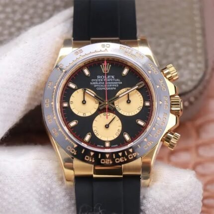 18K Yellow Gold Plating on 904 Solid Stainless Case with Rolex Markings and Engravings like the Authentic.The Best Rolex Daytona Model Replicated up to Date. The First Rolex model to adopt a 904L Steel on Casing and Strap which is the same steel used by Rolex. Compared with an Original Side by Side and there were NO Differences Whatsoever. Complete list of details have been stated below and you will see that tremendous amount of detaiing and work has been put into this edition.